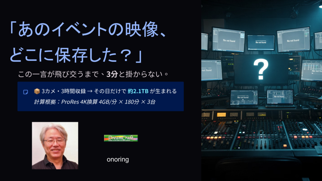 「IPで送ったあの素材、どこにある?」 この記事の対象読者:NDI・SRT・ライブ配信など映像IP伝送に関わる制作プロフェッショナル。撮影現場で「素材が見つからない」「整理されていない」「消えた」という経験を持つすべての方。 素材は「送った瞬間」か... -
