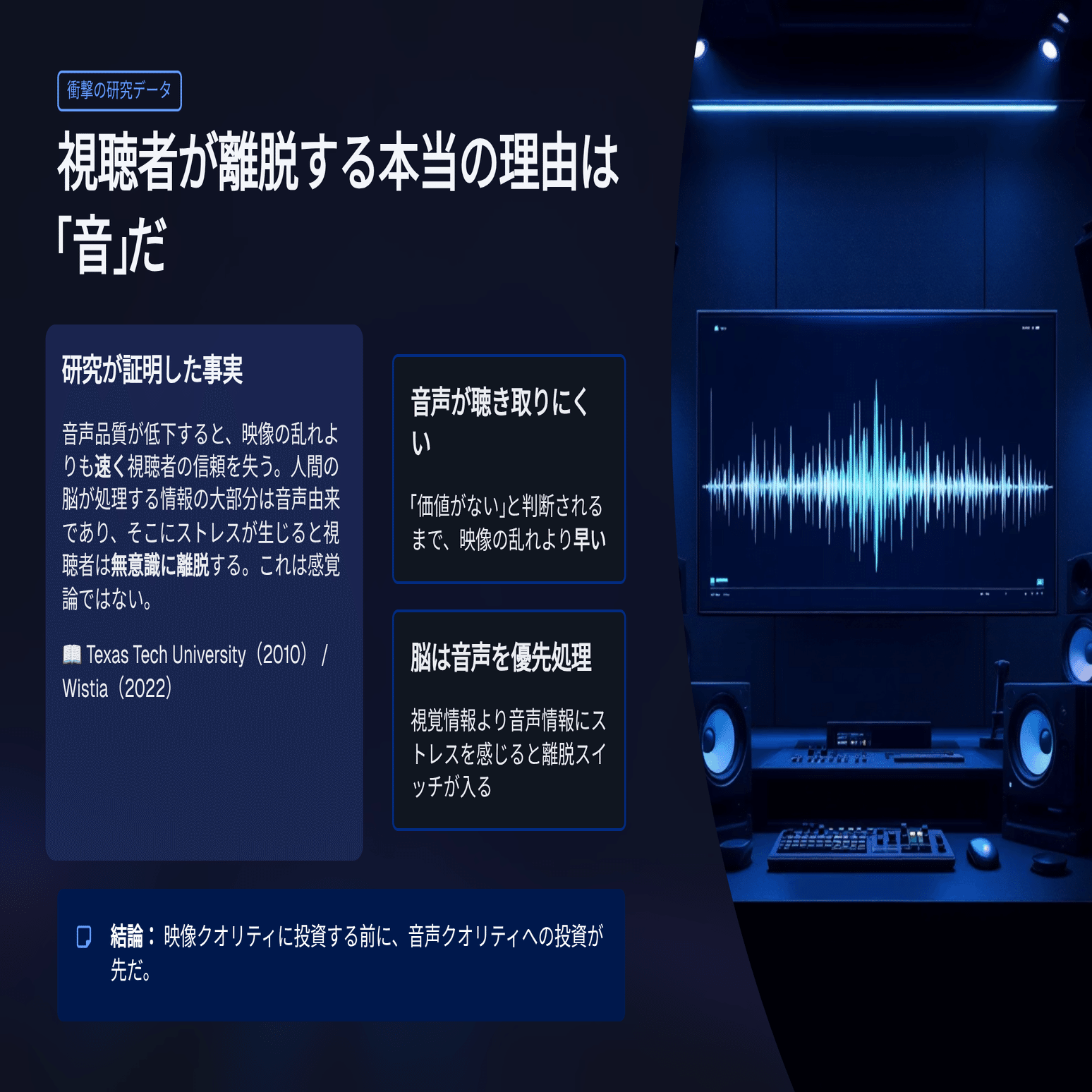 テキサス工科大学の研究(2010年)とストリーミングプラットフォームWistiaが独立して行った調査(”Understanding Audience Retention” 2022)はともに、音声が聴き取りにくい状態では、視聴者がコンテンツを「信頼できない・価値がない」と判断するまでの時間が、映像品質低下の場合よりも短いことを示している。