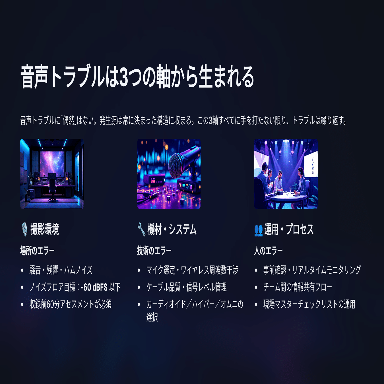 この3軸は互いに独立していて、かつ音声トラブルの原因を網羅している。どれか1軸だけを強化しても不十分で、3軸すべてに対して手を打つ必要がある。