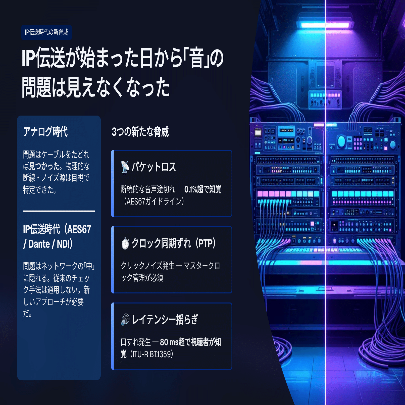 アナログ配線の時代、問題が発生した箇所はケーブルをたどれば見つけられた。AES67やDanteのようなネットワーク音声プロトコルが導入されると、問題の発生場所は「ネットワークの中」に移動した。パケットロスによるドロップアウト、クロック同期のずれによるノイズ、レイテンシーの揺らぎによる音声と映像のずれ。これらは従来の音声チェック方法では発見できない。