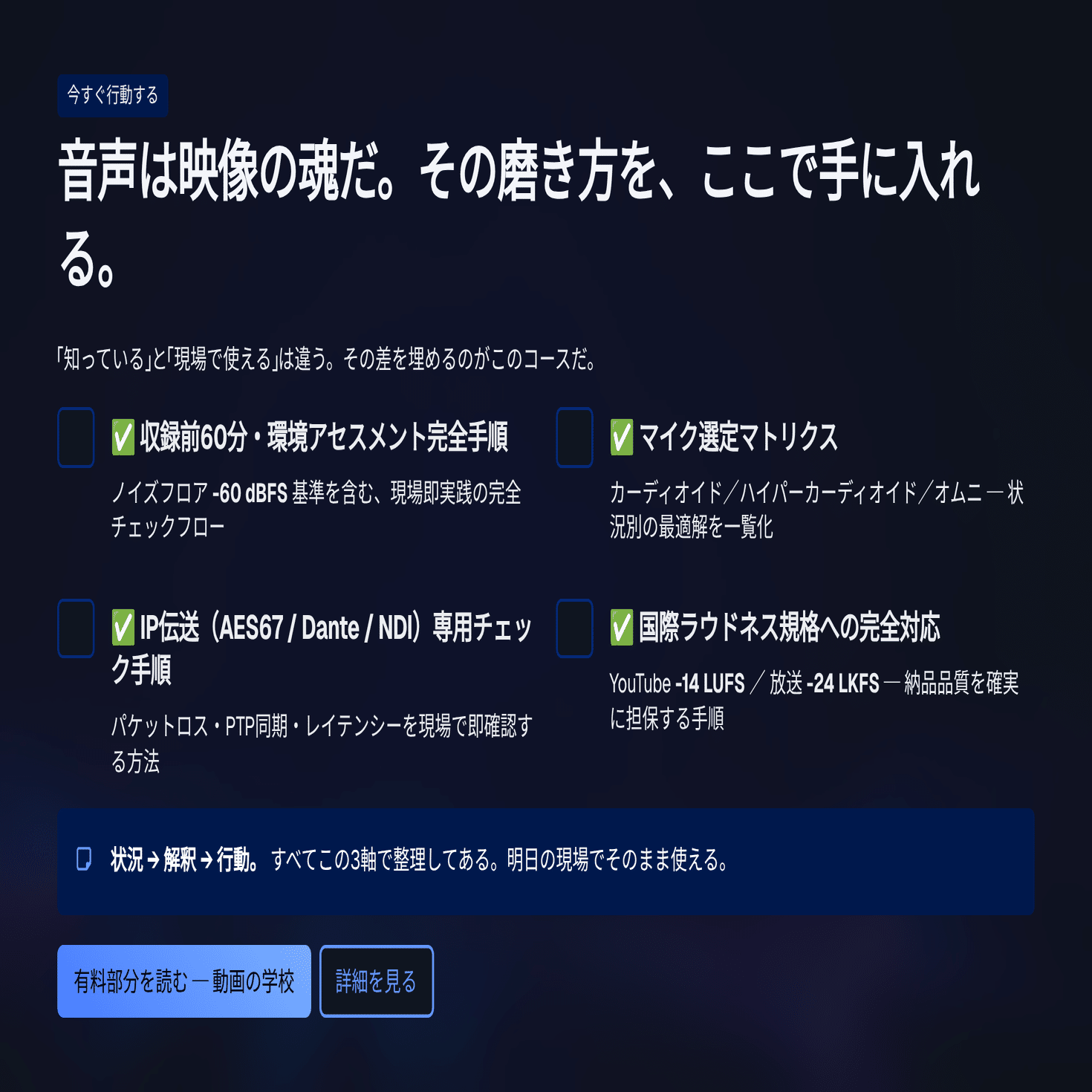 音声は映像の魂だ。その魂を磨く技術と知識を、ここで手に入れてほしい。