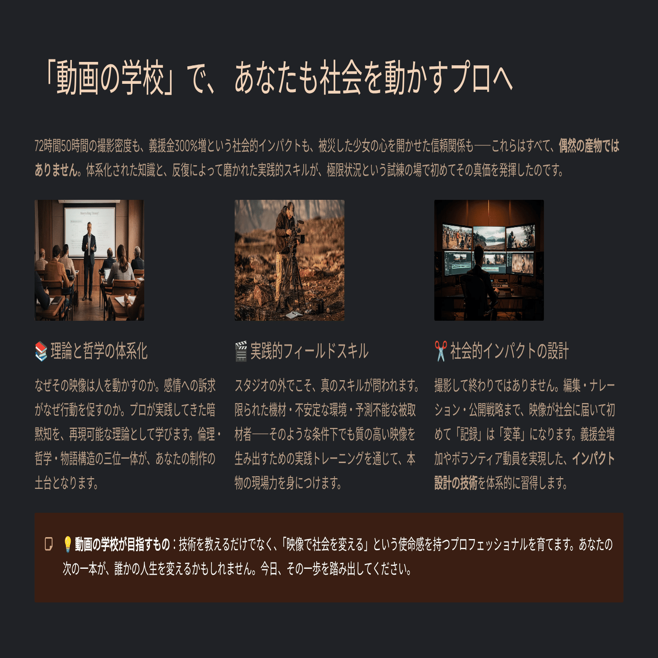 その具体的な「手法」と「哲学」のすべてを、ここから先に記す。これは、技術を社会の力に変えたいと願う、すべてのプロフェッショナルへ贈る記録である。そして、その力を自らの手で掴み取りたいと願う者にとって、「動画の学校」が提供する学びが、いかに重要であるかを理解する一助となるだろう。