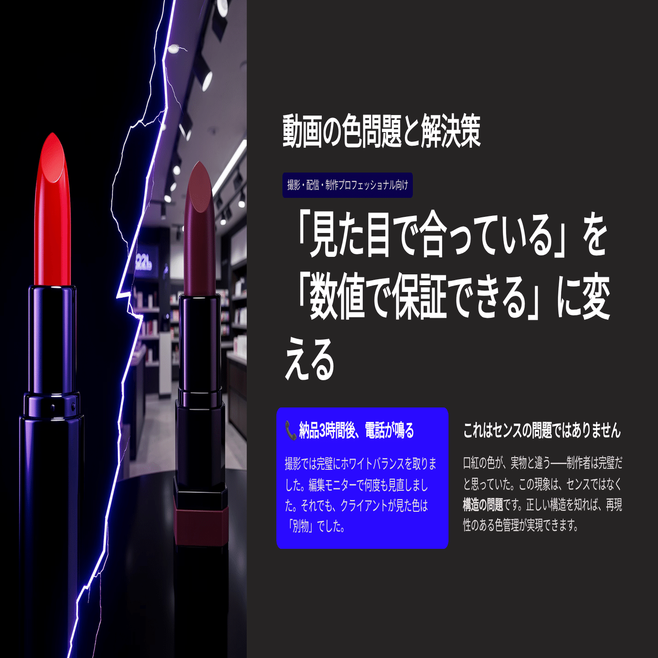 ある化粧品ブランドの撮影現場。撮影・編集・試写、どの段階でも問題は見当たらなかった。しかし納品から3時間後、クライアントから電話が入る。「口紅の赤が、店頭サンプルと違って見える」。