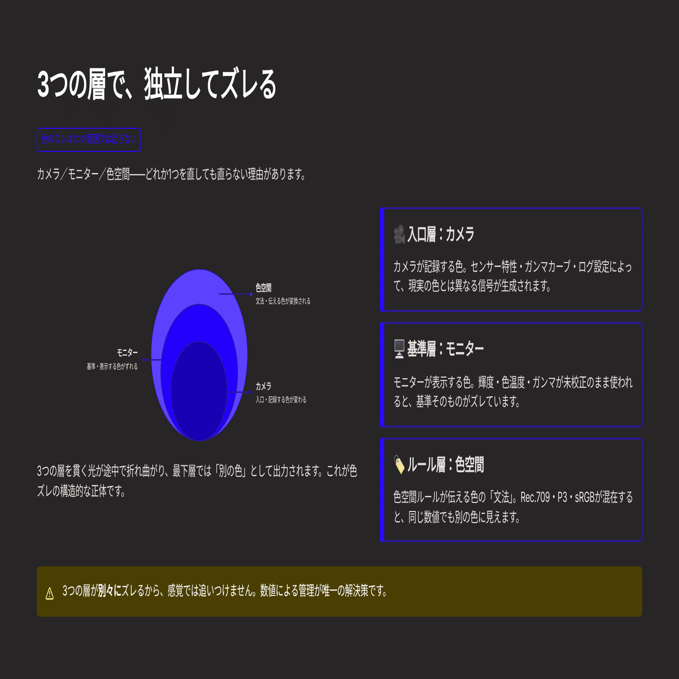 この構造は、3人の翻訳者が同じ原文を違う辞書で訳すのに似ている。訳された文章はそれぞれ「文法的には正しい」が、原文のニュアンスは失われる。映像の色も同じだ。カメラが記録した色を、モニターが正しい辞書で翻訳し、色空間ルールが正しい文法で伝えない限り、視聴者には「別の色」が届く。