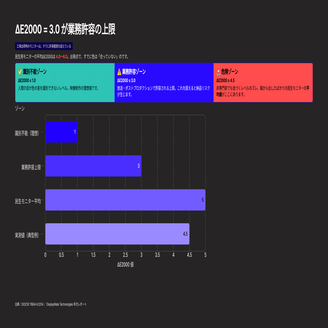 一方、市販の民生用モニターで工場出荷状態のまま使用した場合、sRGB表示モードであってもΔE2000の平均値が3.0を超える製品が業界レポートで報告されている(出典:DisplayMate Technologies年次レポート / X-Rite社カラーマネジメント白書)。つまり「買ったままのモニターで色を判断する」という行為は、出発点で許容範囲を超える誤差を抱えていることになる。
