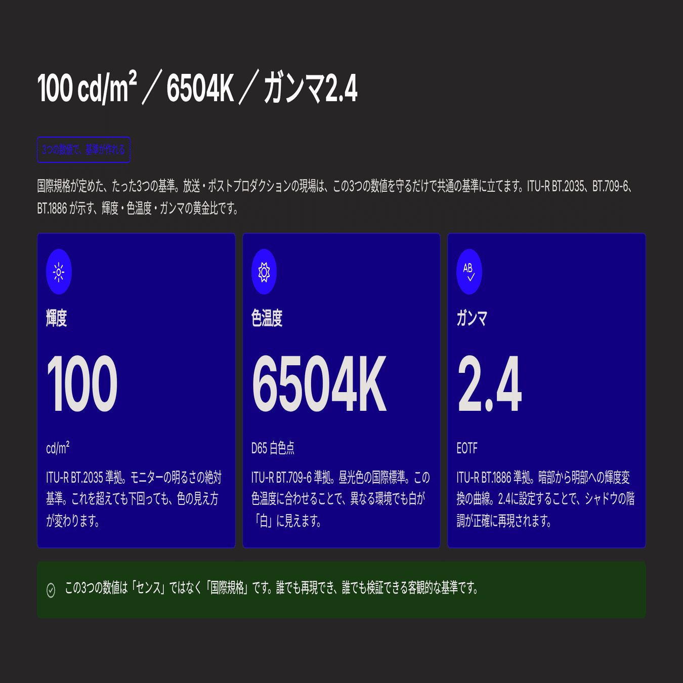 カメラ側の「入口」、モニター側の「基準」、色空間設定の「ルール」。この3層の整合性が取れて初めて、色は「届く」状態になる。逆にどれか1つでも欠ければ、制作者の見ている映像と、視聴者の見ている映像は別物になる。