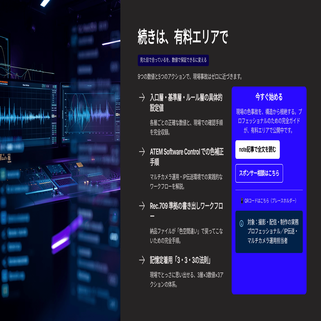 対象読者: 撮影・配信・制作の実務に関わるプロフェッショナル。IP伝送を含む現代の映像ワークフローで「色が合わない」問題に直面しているすべての現場担当者。