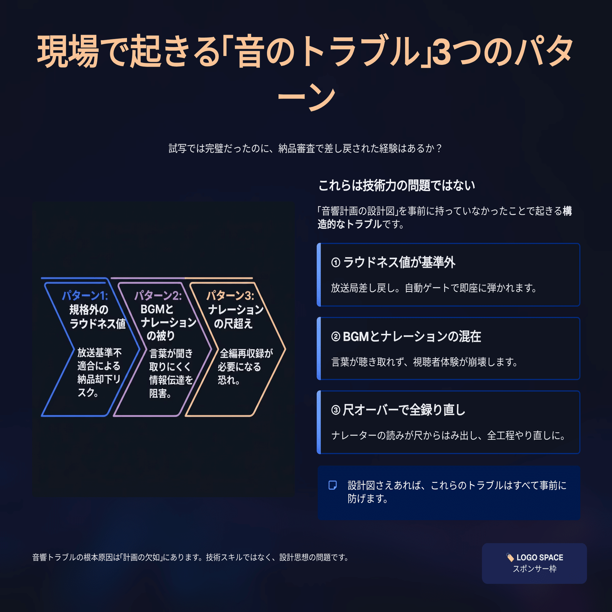 これらは技術力の問題ではない。音響計画の設計図を事前に持っていなかったことで起きる、構造的なトラブルだ。