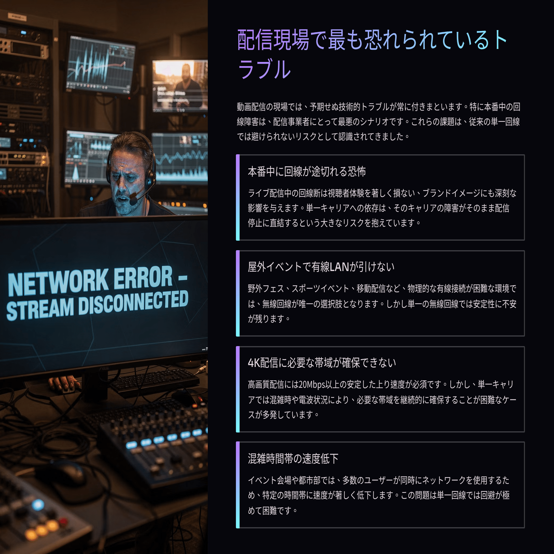 配信現場で最も恐れられているトラブル、それは「回線の不安定さ」だ。