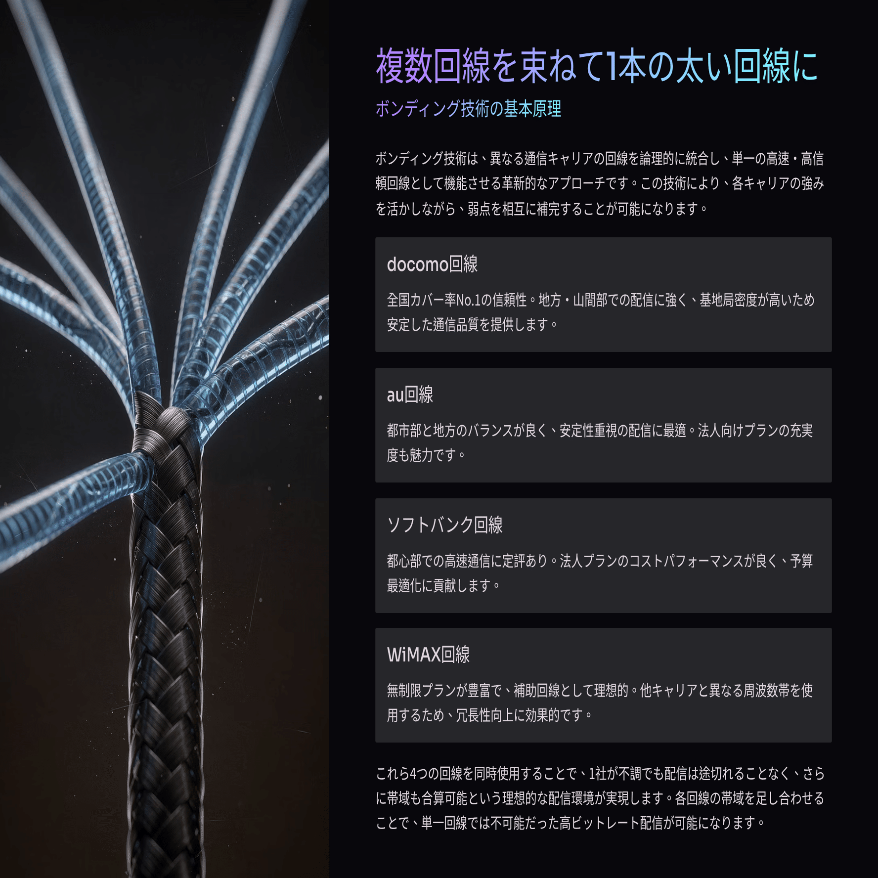 docomo、au、ソフトバンク、さらにはWiMAXなど、複数のキャリア回線を束ねて使う。これにより、1社の回線が不調でも配信は途切れない。帯域も合算できるため、4K配信も現実的になる。