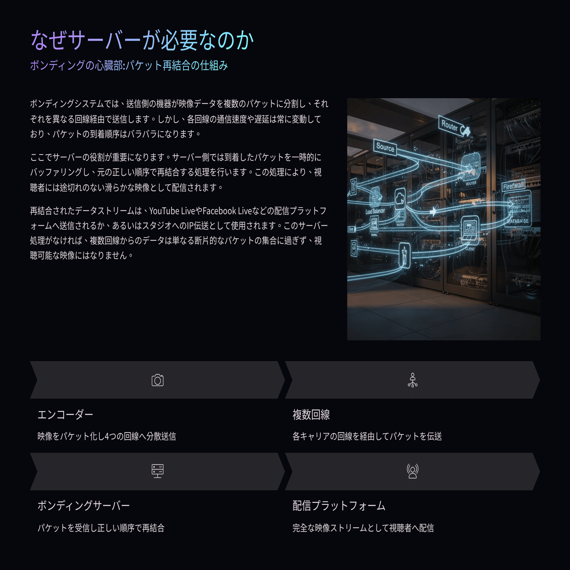 【サーバー側(受信・再結合)】 3. サーバーでの受信:各キャリアから届いた全パケットを受信 4. パケットの再結合:バラバラに届いたパケットを正しい順序で組み立て直す 5. 映像データの復元:元の映像ストリームに復元