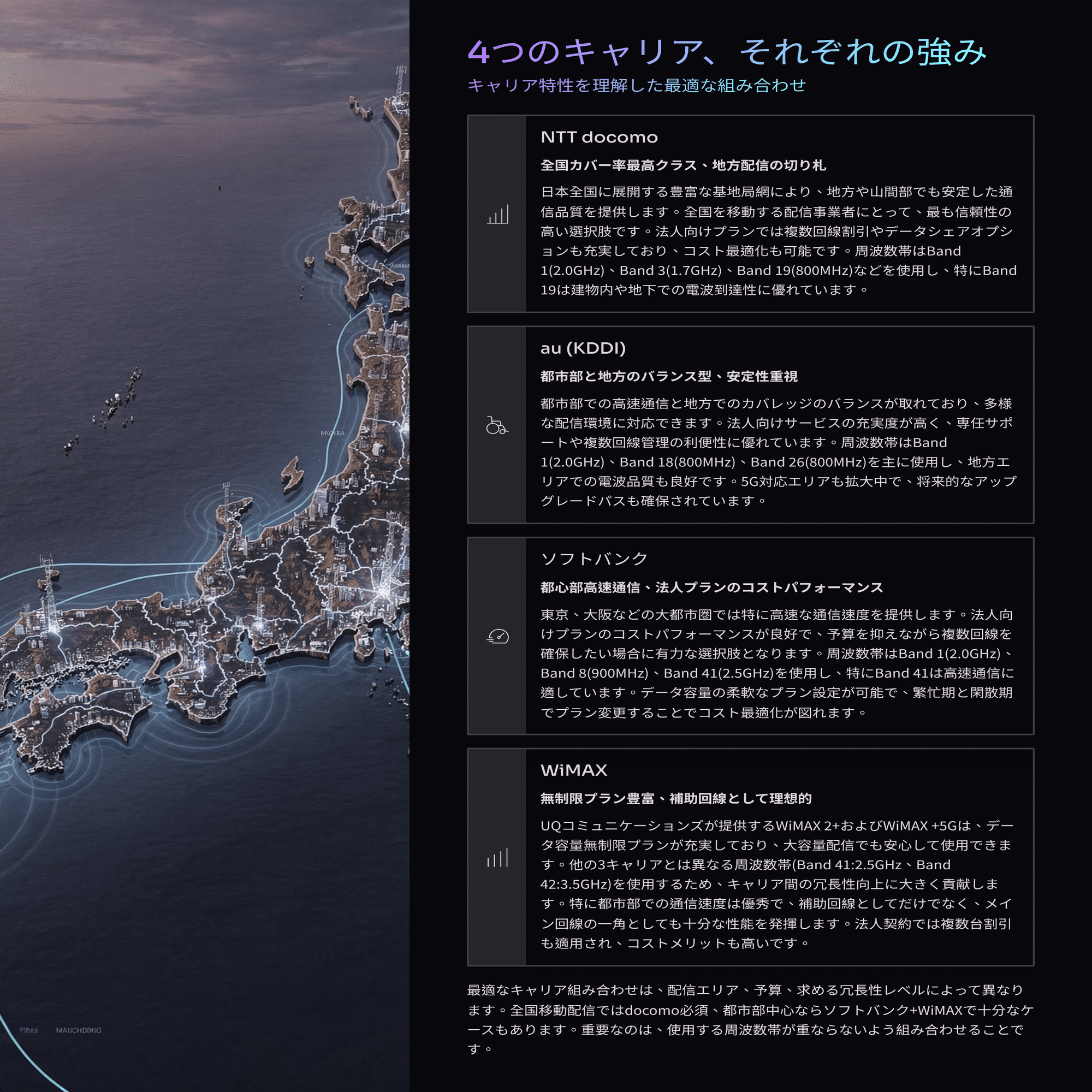 現場の立地条件によって、どのキャリアをメインにするか、どう組み合わせるかが変わってくる。