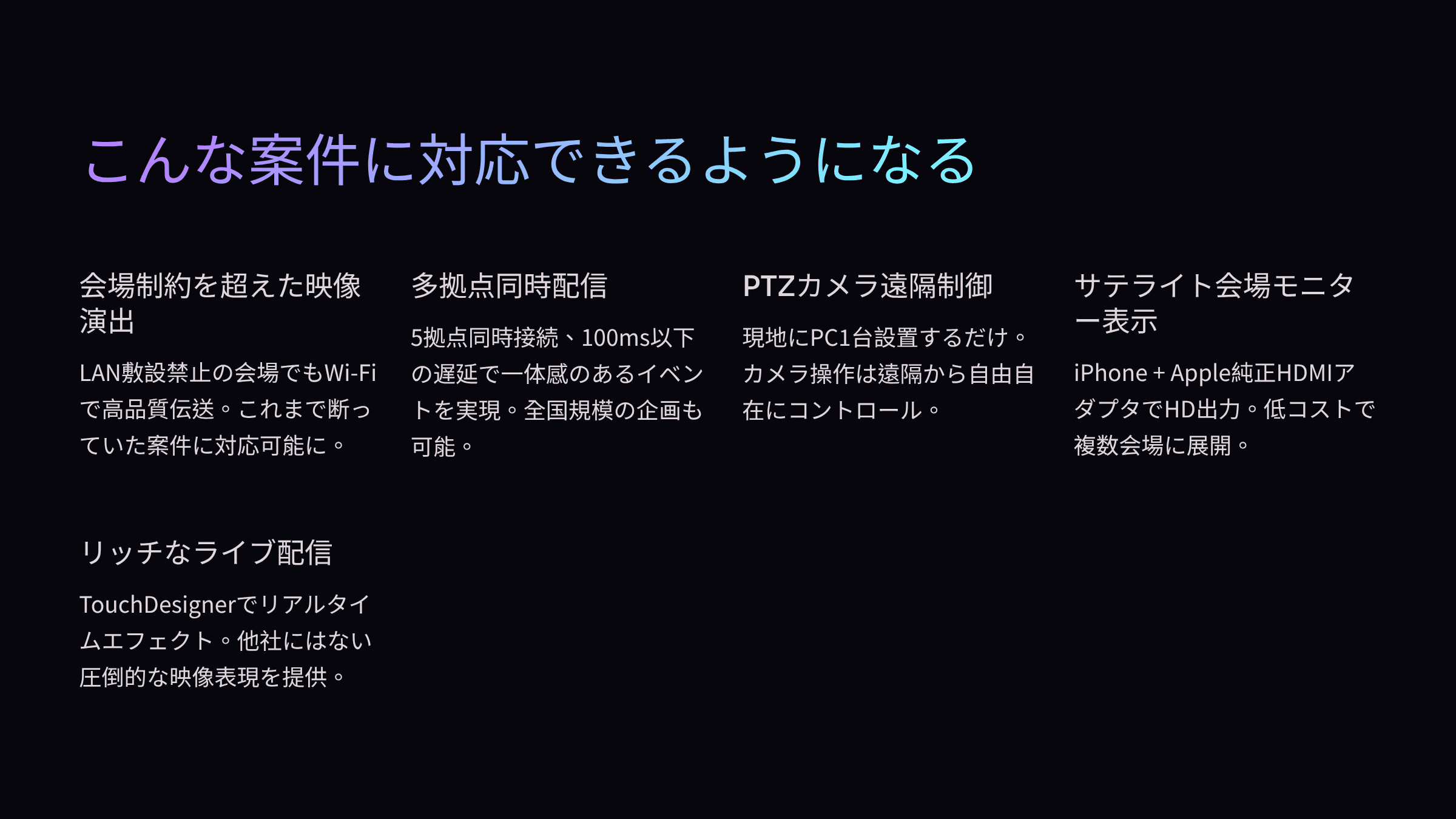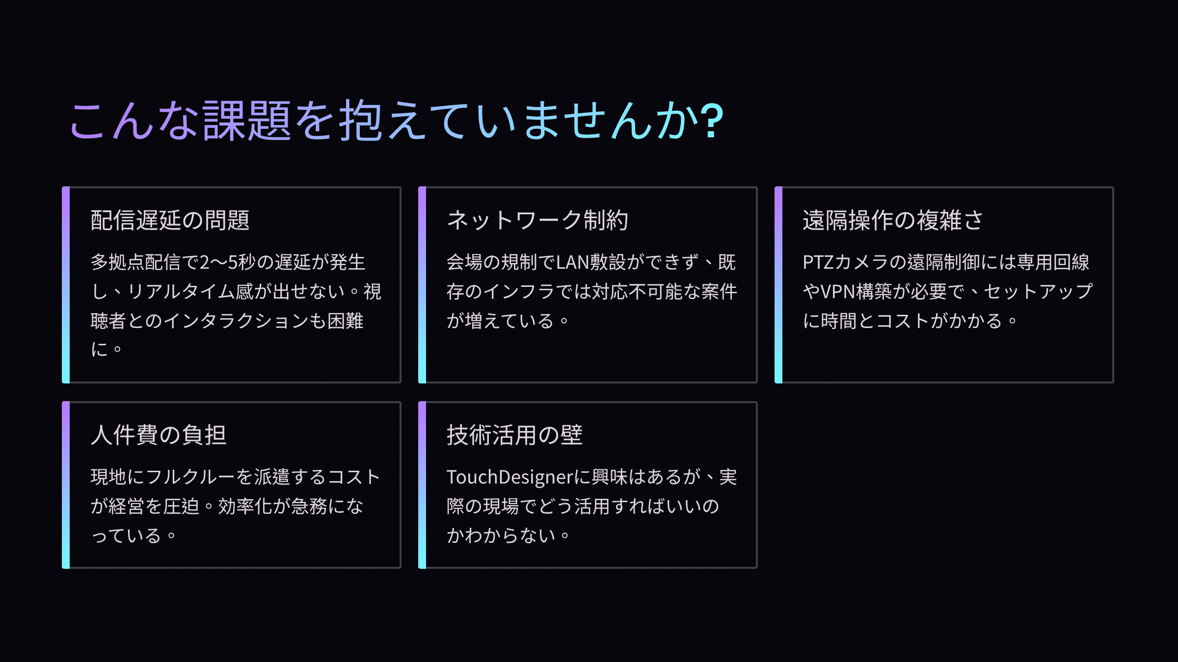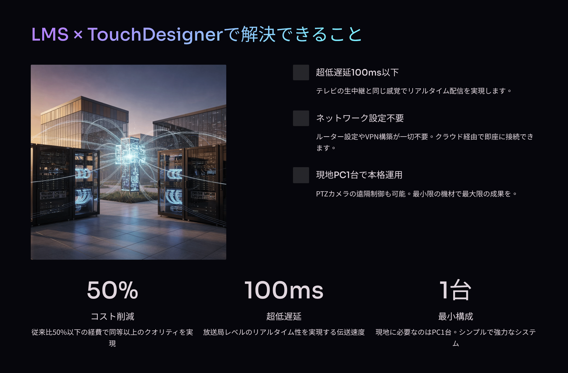 課題 従来の壁 LMS × TDでの解決 会場のLAN敷設禁止 NDI使用不可、SDI敷設も不可 Wi-Fi経由でLMS伝送、ルーター設定不要 多拠点のリアルタイム連携 遅延2〜5秒、専用回線は高コスト 100ms以下で5拠点同時受信、経路設定不要 PTZカメラの遠隔制御 映像と制御が別系統、VPN必要 現地にDeckLink+PC、映像と制御を統合伝送 遠隔からの制御 リモートデスクトップは操作性悪い 制御信号もLMSで双方向通信 リッチなライブ配信 専用システムは高額 TouchDesignerで柔軟に対応、SDI/NDI両出力