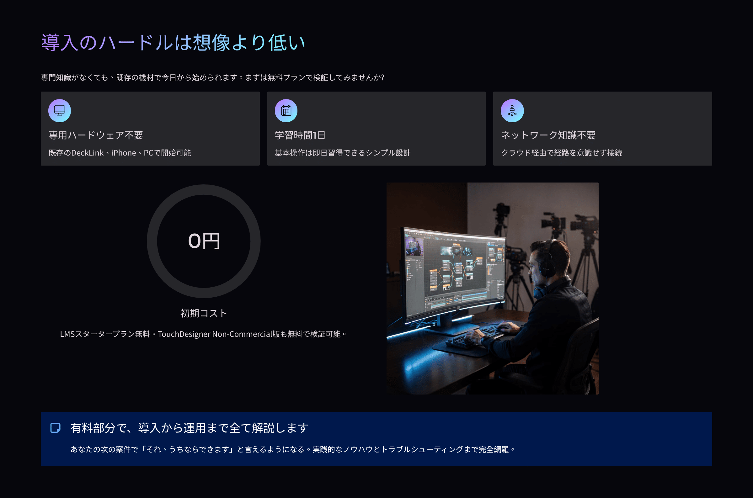 迷っている時間があるなら、まずは試してみてほしい。LMSのスタータープランは無料だ。TouchDesignerのNon-Commercial版も無料で使える。環境構築まではノーコストで到達できる。