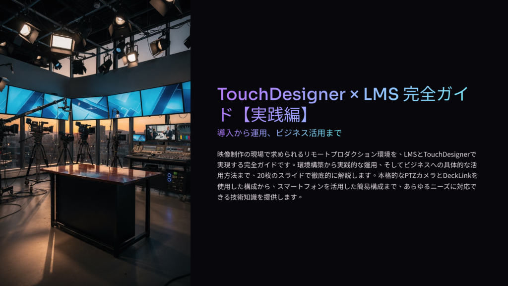 本記事は、**「映像制作の現場経験はあるが、TouchDesignerとLMSの組み合わせはこれから」**という層に向けて、実践的な導入・運用方法を解説するものだ。