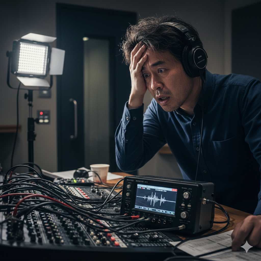 大昔、大事なインタビュー撮影で、ミキサーアウトをモニターしたまま収録してしまったんです。現場では全く気づかず、お客様が帰ってレコーディング素材を確認した瞬間に血の気が引きました。レベルオーバーして歪んでます。あの時の絶望感は、今思い出しても震えます。プロとして最低のミスでした。