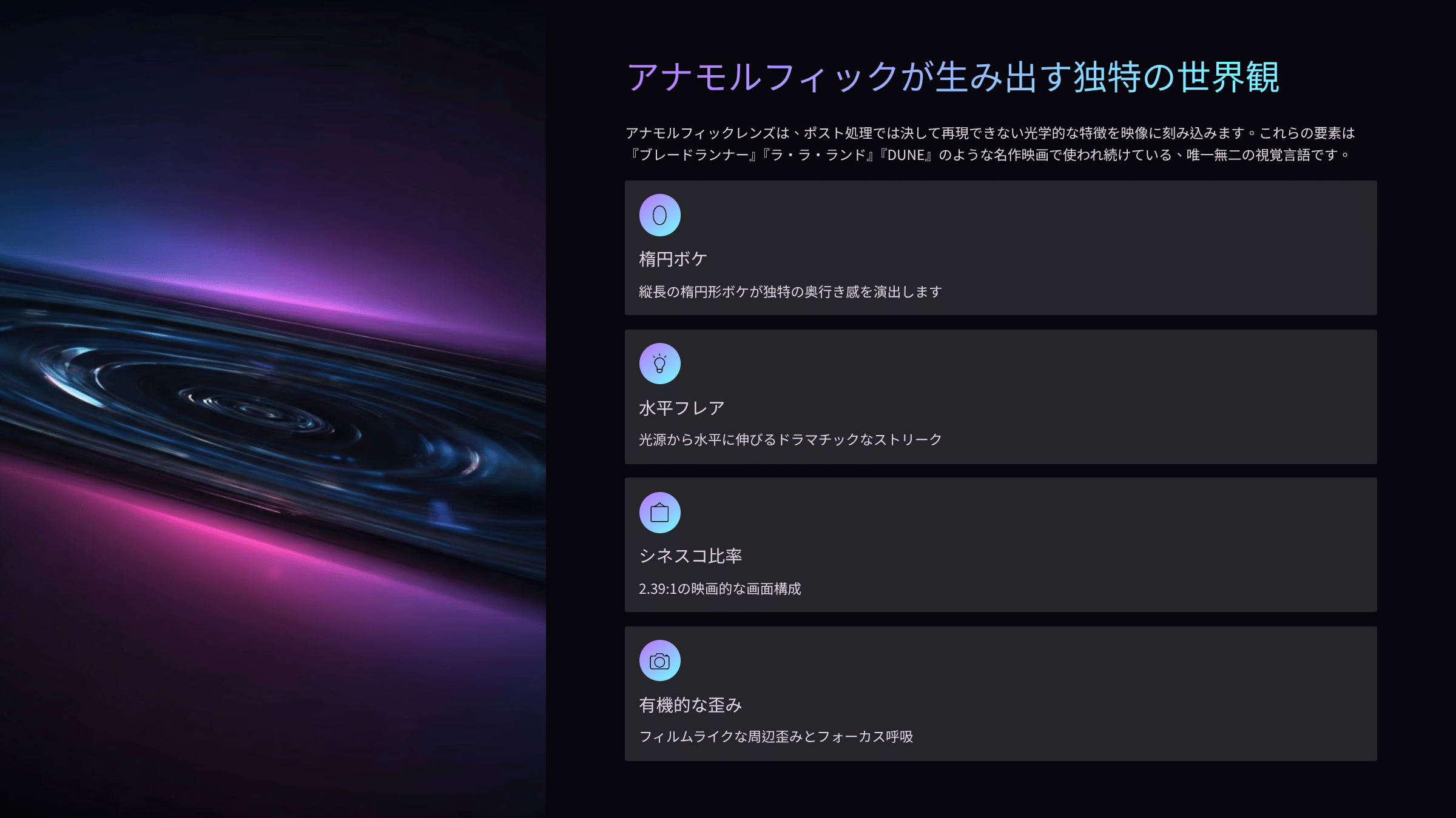特徴内容映像への影響楕円ボケ縦長の楕円形ボケ独特の奥行き感、映画的印象水平フレア光源から水平に伸びるストリークドラマチックな光の演出ワイドアスペクト2.39:1などのシネスコ比率映画的な画面構成周辺歪み樽型・糸巻型の歪み有機的、フィルムライクな印象シャローDOF感水平方向の圧縮による錯覚同じT値でもより浅く見えるフォーカス呼吸フォーカス時の画角変動有機的な動き、没入感