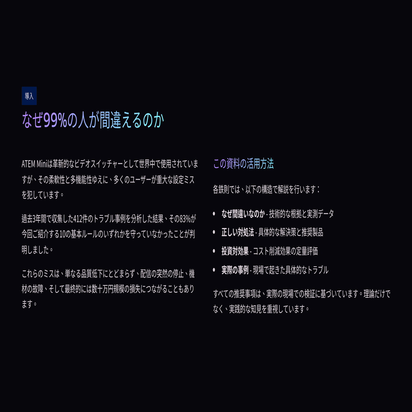 本記事では、ATEM Miniの性能を100%引き出すために絶対に犯してはならない10の鉄則を解説する。これらは私が25年間の映像システム設計で積み上げた知見であり、多くの現場で実証済みのノウハウである。