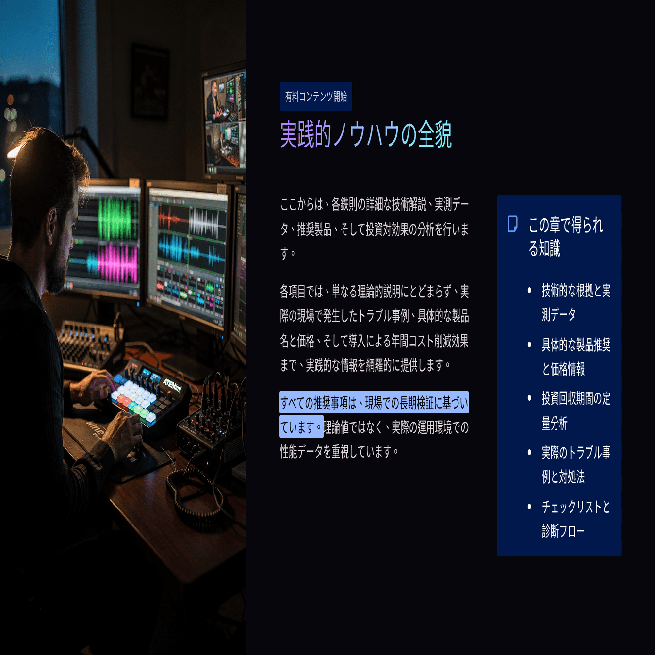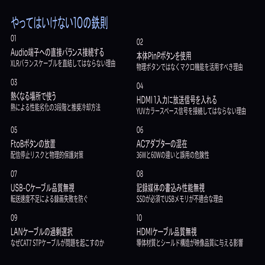 本番中の配信停止によるクライアント損失。機材の早期故障による買い替えコスト。トラブル対応に費やされる年間120時間以上の時間的損失。これらは全て、10の基本原則を守るだけで回避できるものだ。