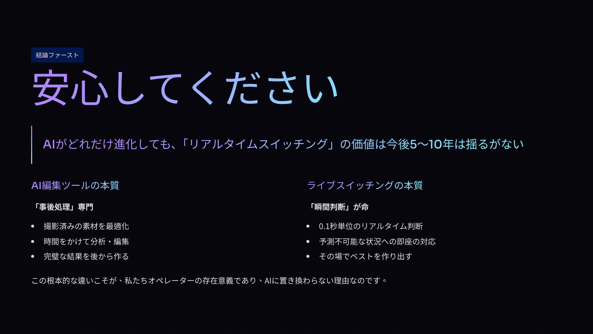 AI編集ツールがどれだけ進化しても、ライブ配信における「リアルタイムスイッチング」の価値は、少なくとも今後5〜10年は揺るぎません。