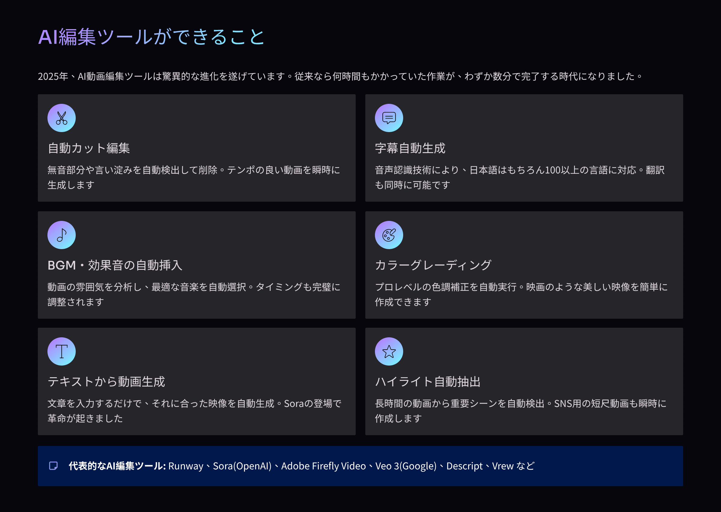 まず、AI編集ツールが現時点でどこまで進化しているのか、冷静に見ていきましょう。