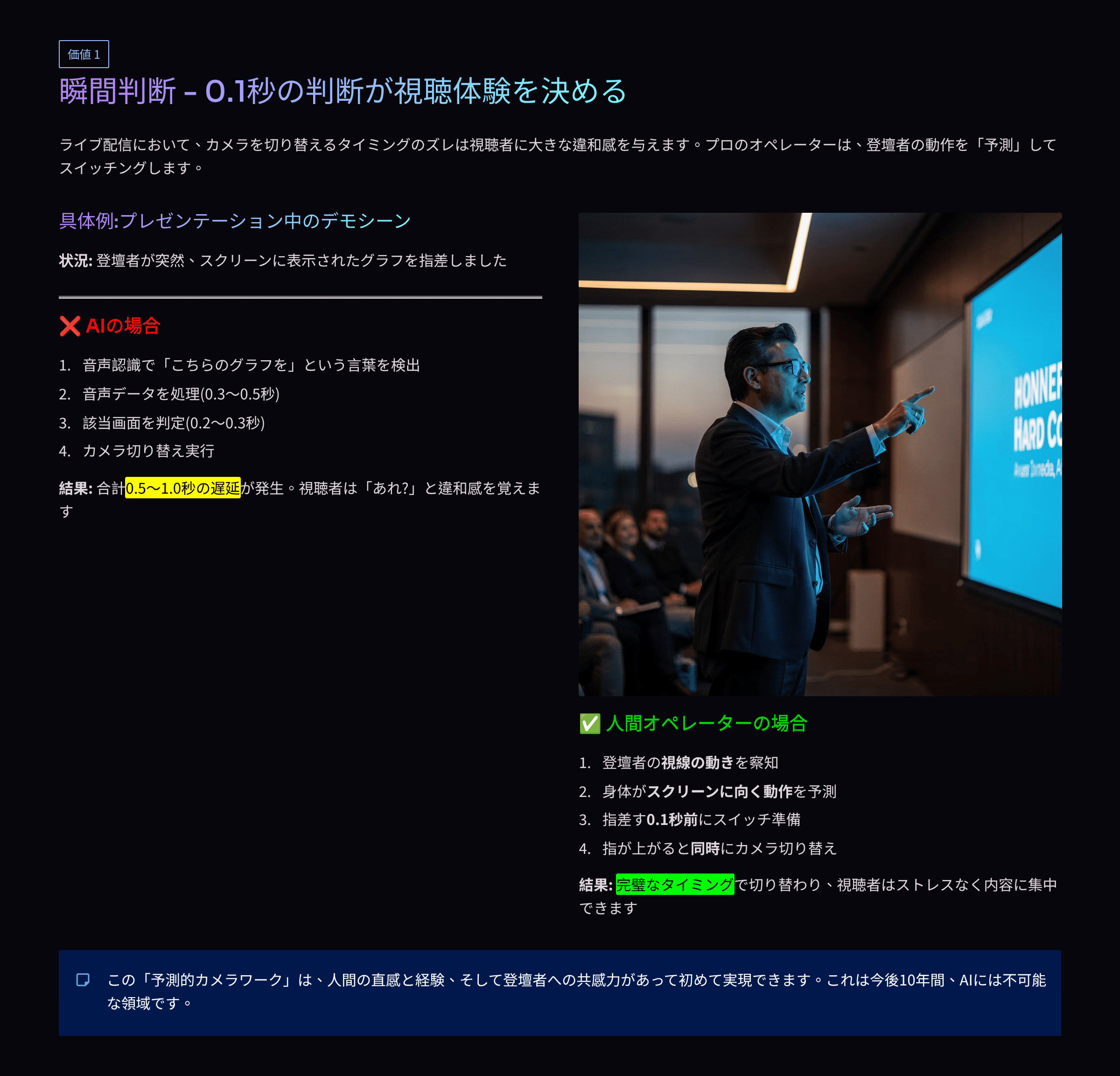 つまり、AIは「編集済み素材の最適化」は得意ですが、「ライブの瞬間判断」は現在では不可能なのです。