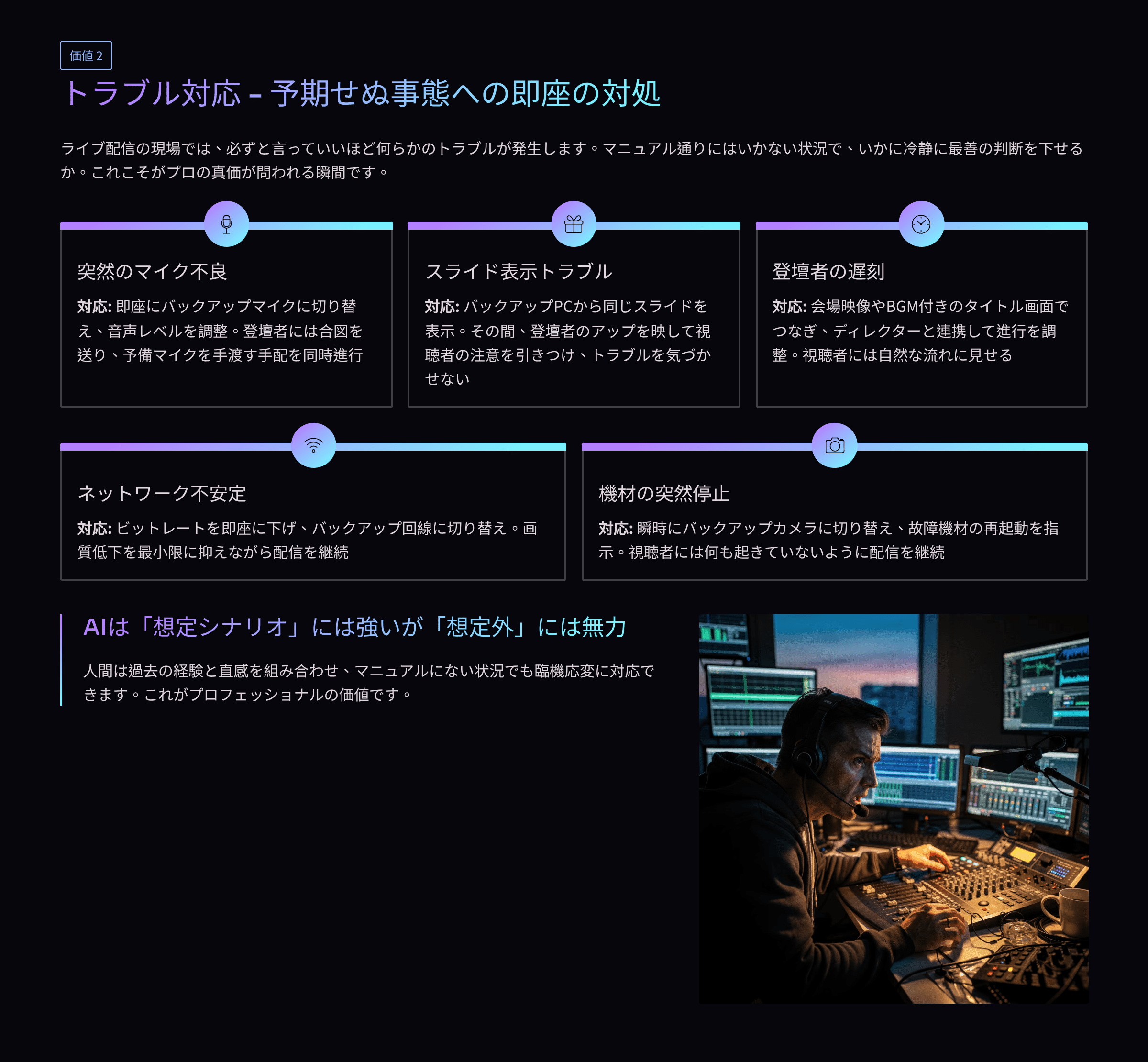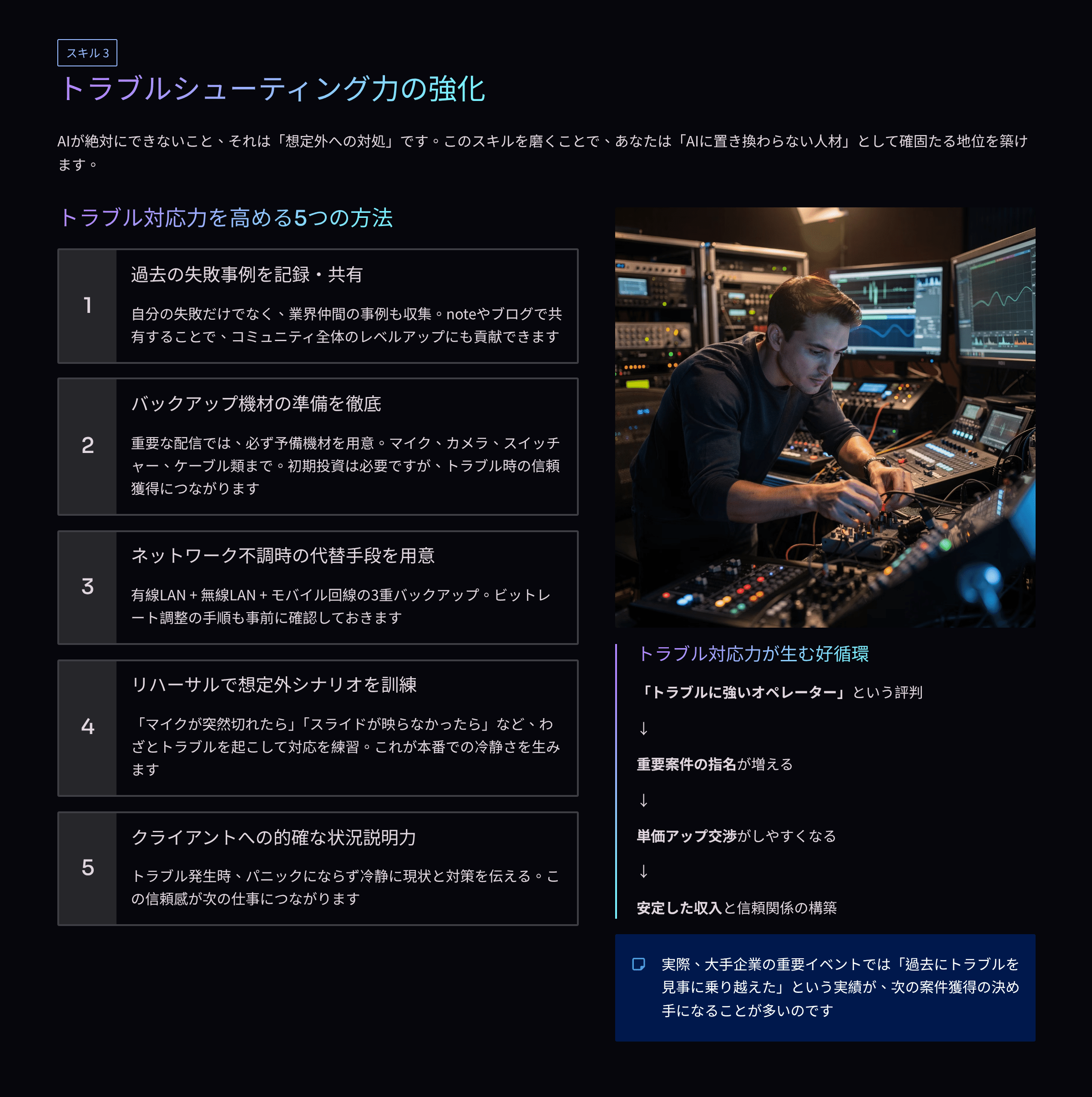 ✅ ライブスイッチングは「瞬間判断」「トラブル対応」「チーム連携」が命