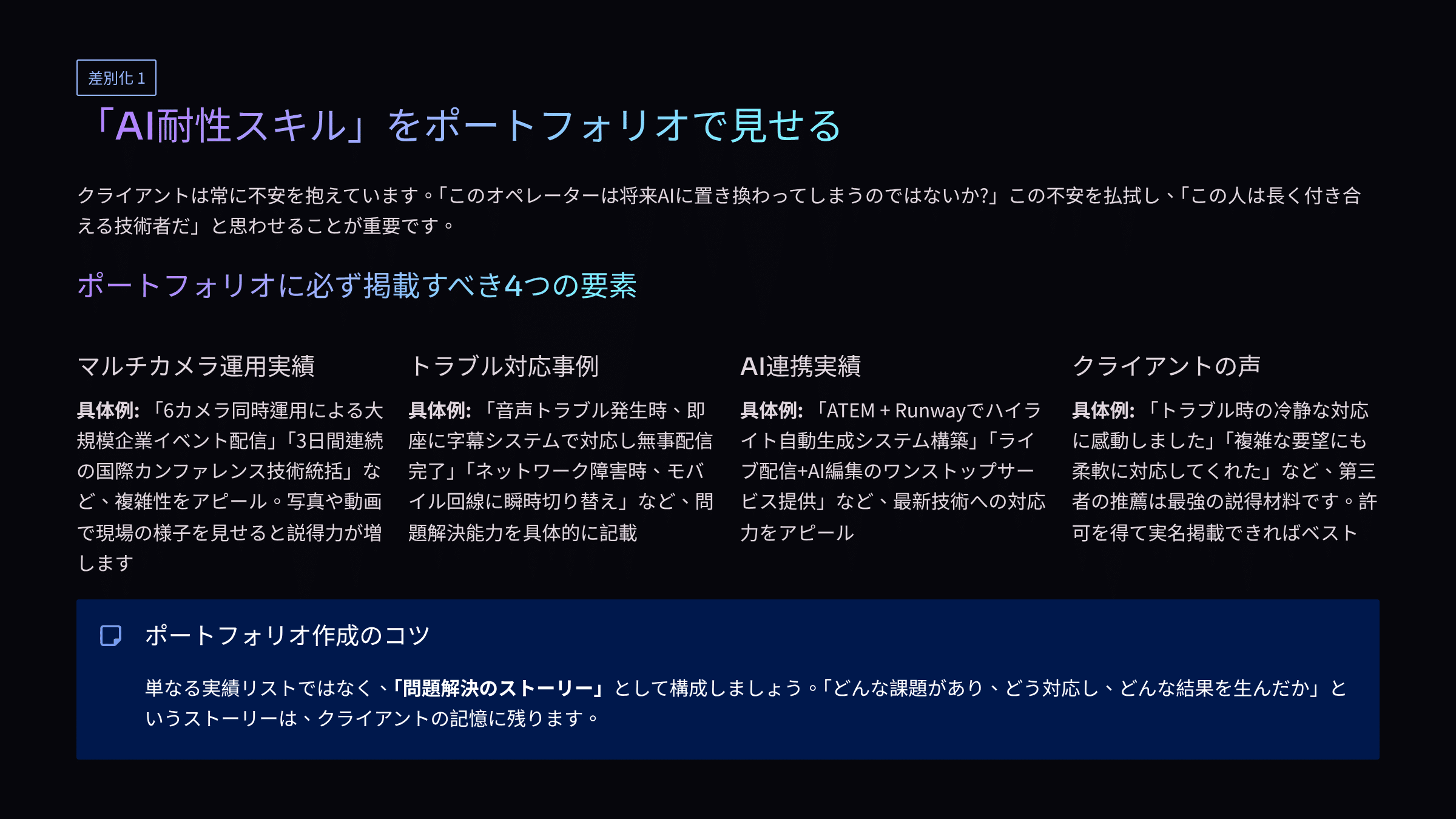 クライアントに「この人はAIに置き換わらない」と思わせるには、ポートフォリオでの差別化が重要です。