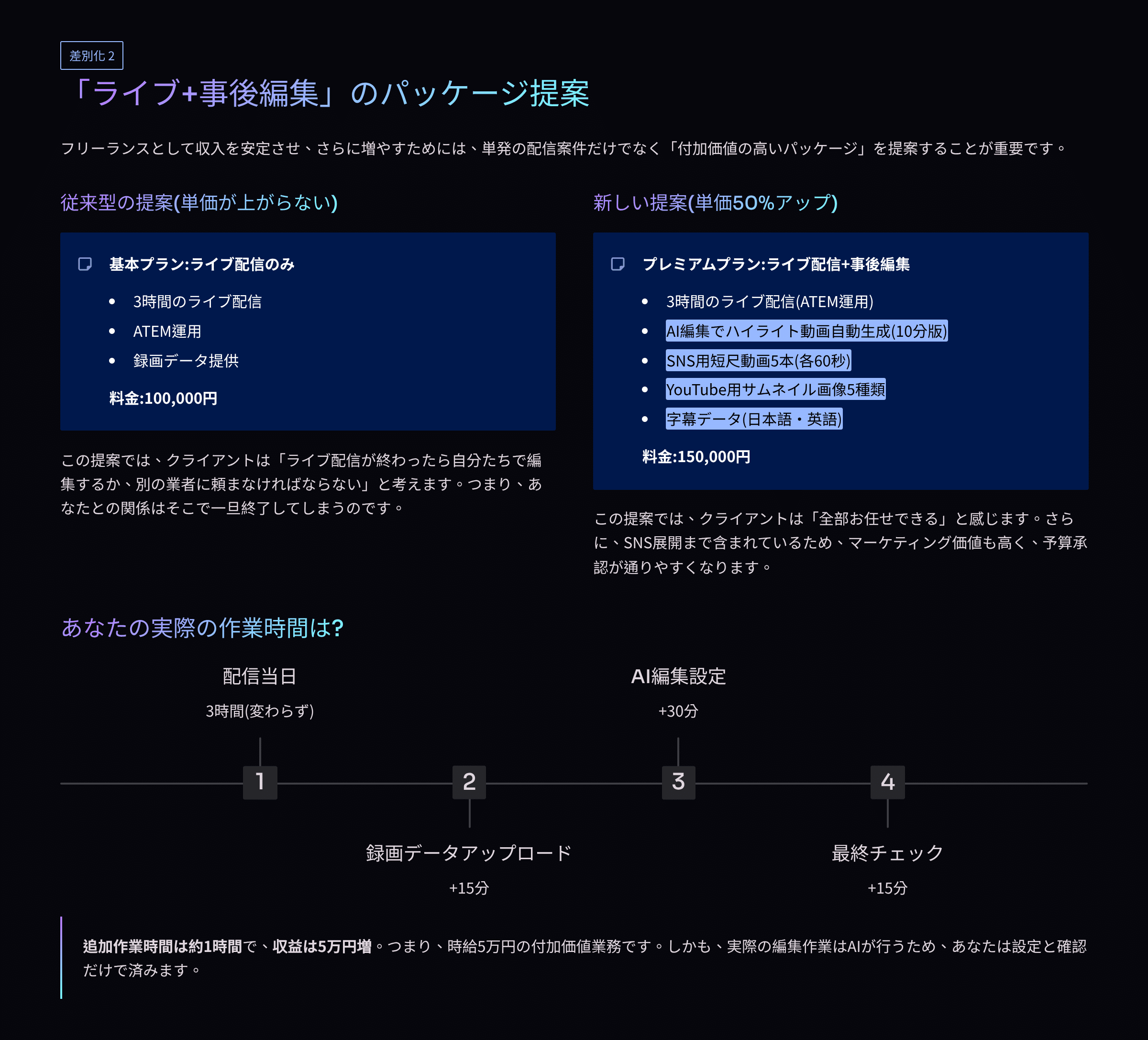 ✅ 「ライブ+事後編集」パッケージで単価1.5倍を実現