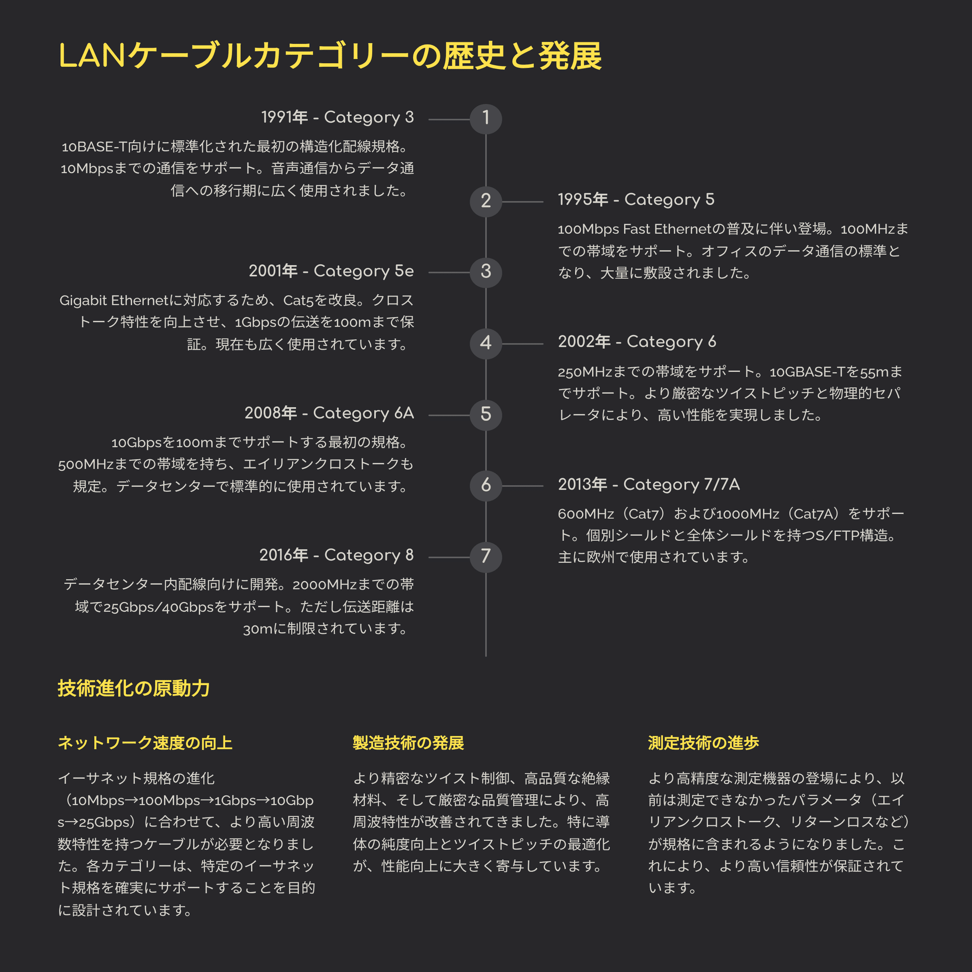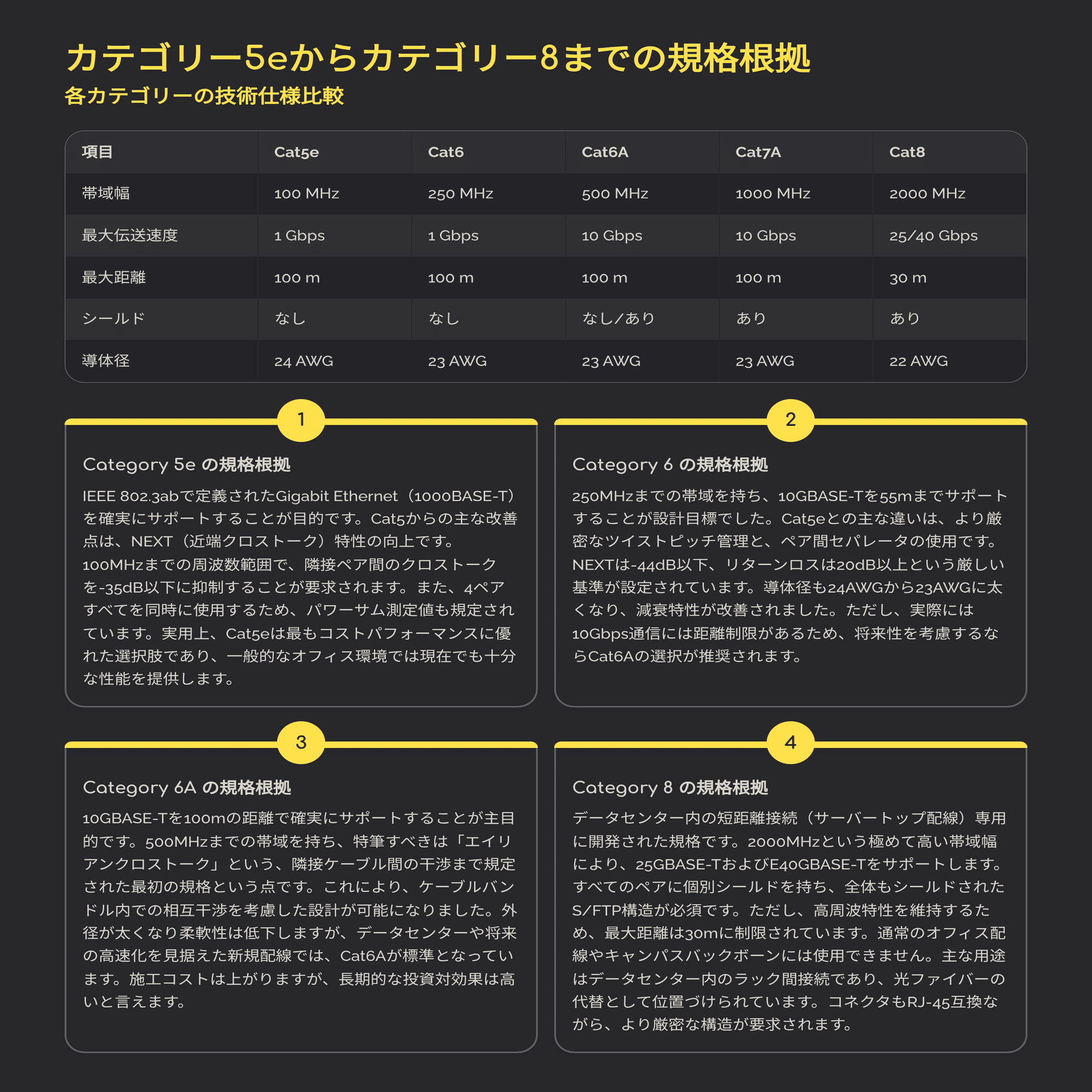 Cat7とCat8は、厳密にはTIA/EIA規格(北米の標準規格)では認定されていない。