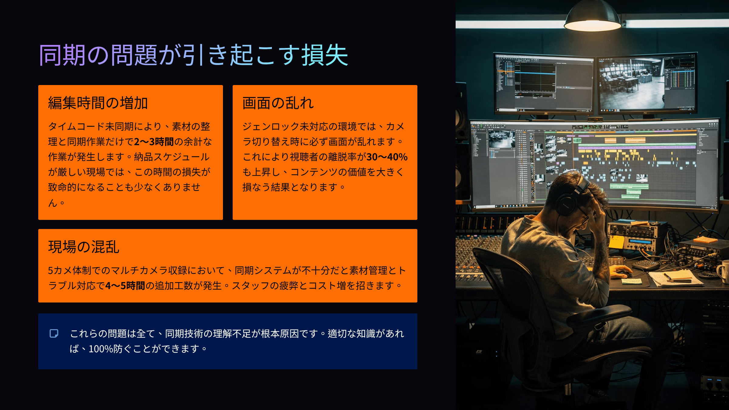 同期の問題は、単なる技術的な不具合ではない。それは現場の生産性と最終成果物のクオリティに直結する。