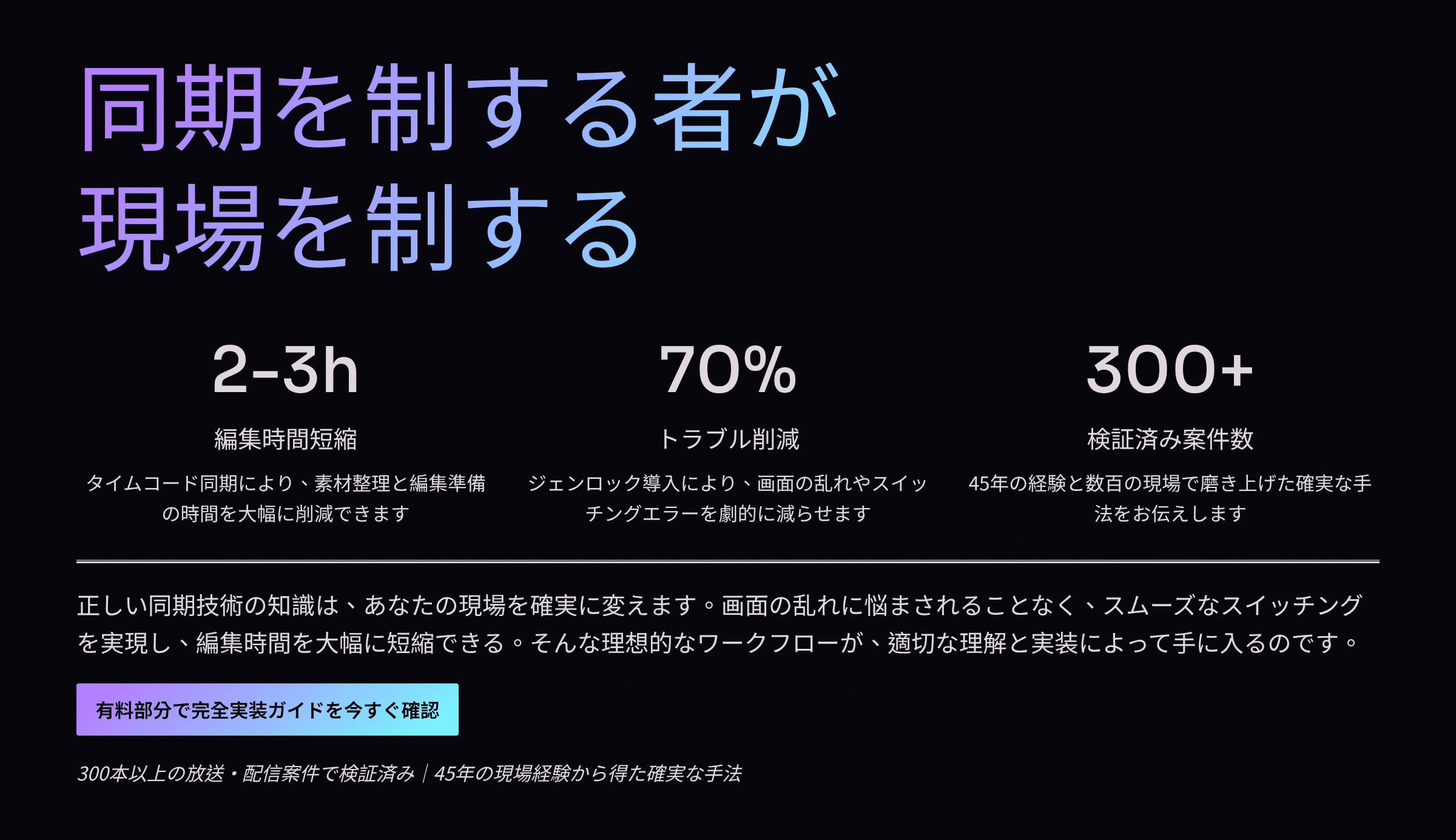 この記事では、45年間で300本以上の放送・配信案件に関わってきたテクニカルディレクターである私の経験をもとに、ジェンロックとタイムコードの本質的な違いと、現場で即座に活用できる実践的なノウハウを伝えていく。