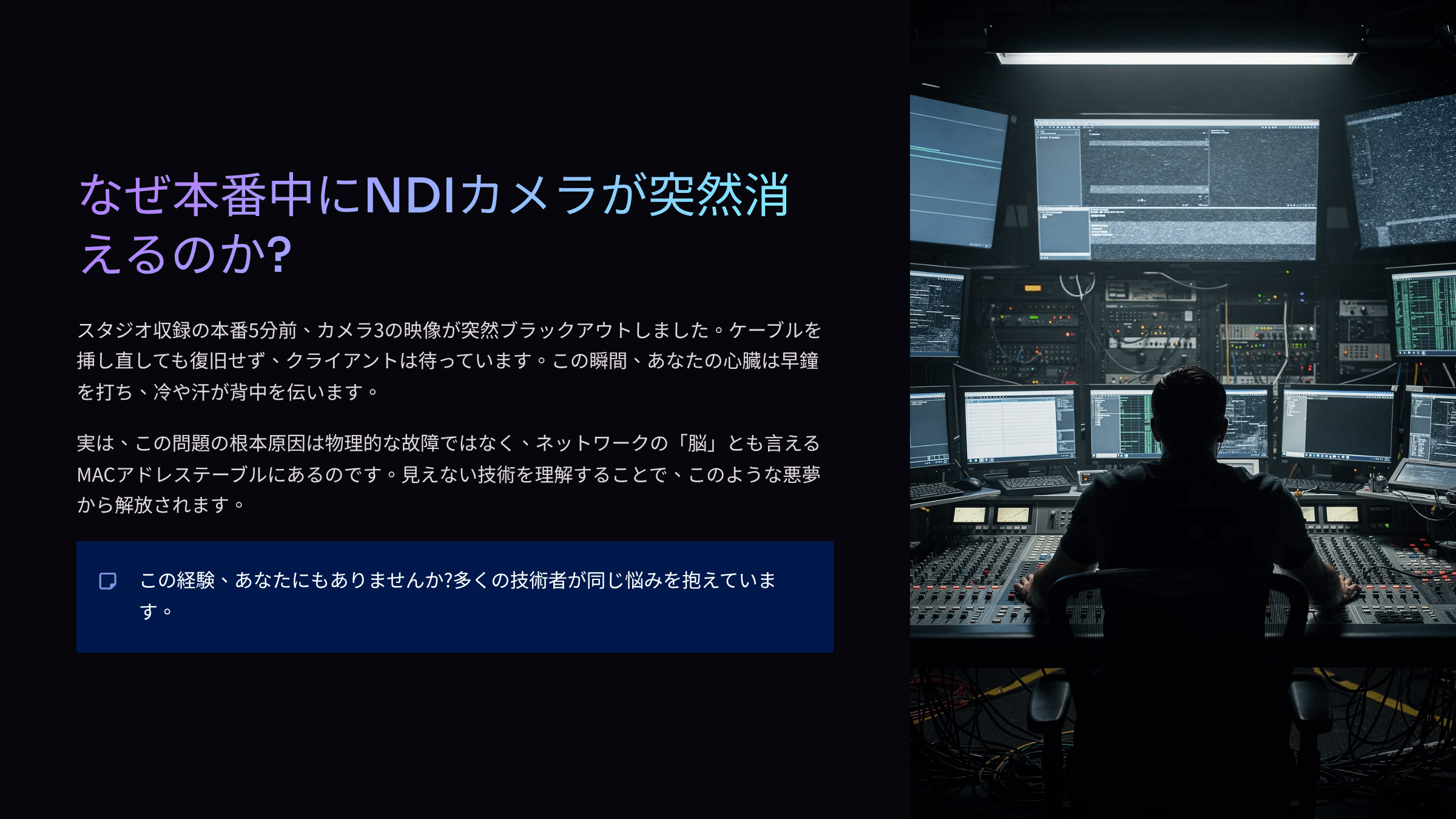 スタジオ収録の本番5分前。モニターに映っていたカメラ3の映像が突然ブラックアウトした。ケーブルを挿し直しても復旧しない。クライアントは待っている。冷や汗が背中を伝う――。