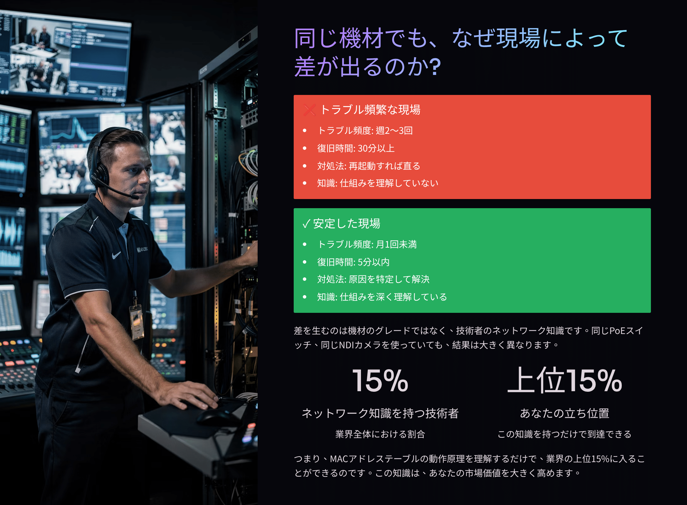 本番中のトラブル対応時間を、平均30分から5分以内に短縮できる。クライアントからの信頼も、あなたのキャリアも、この「見えない技術」の理解から始まる。