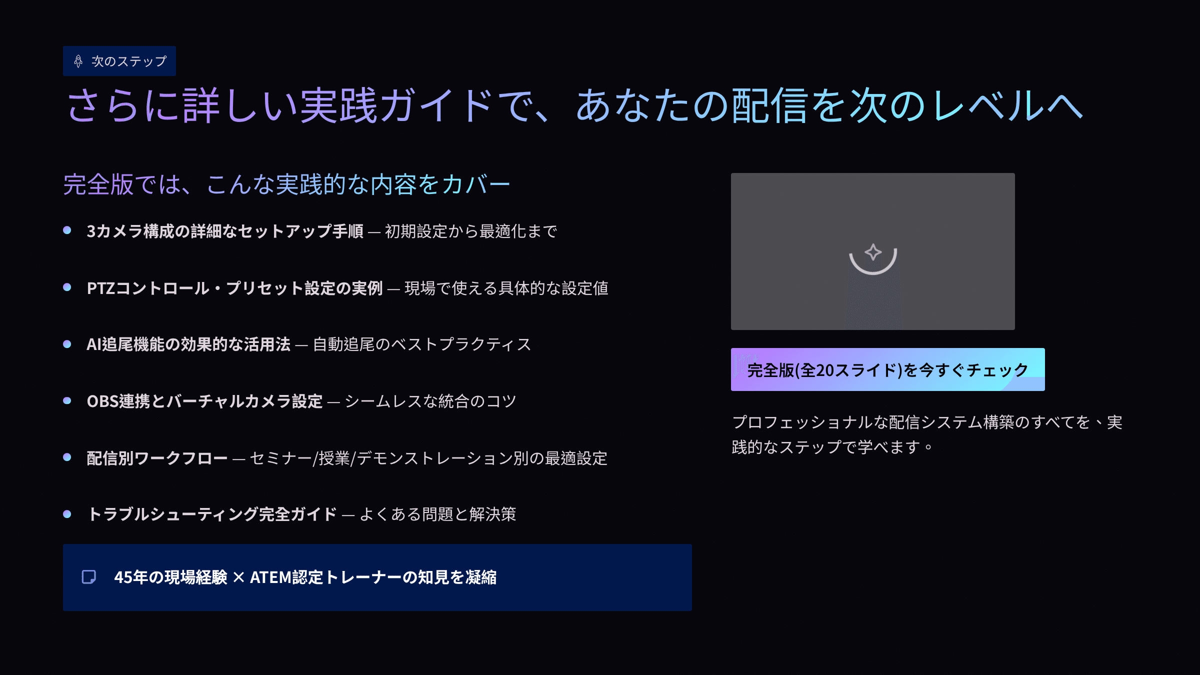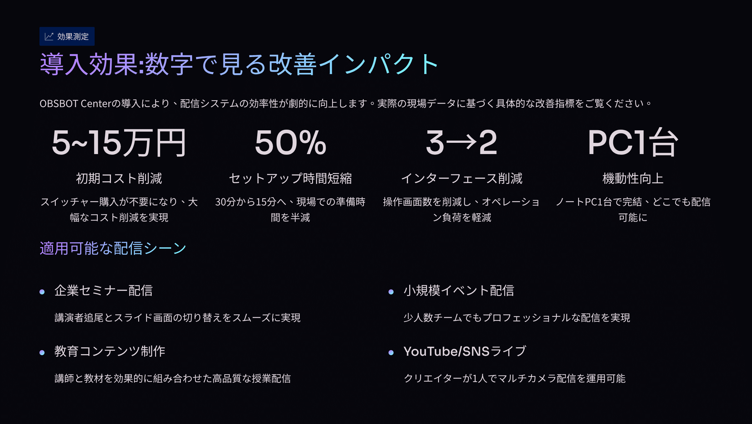 - 機動性向上: ノートPC1台での完結型マルチカメラ配信を実現