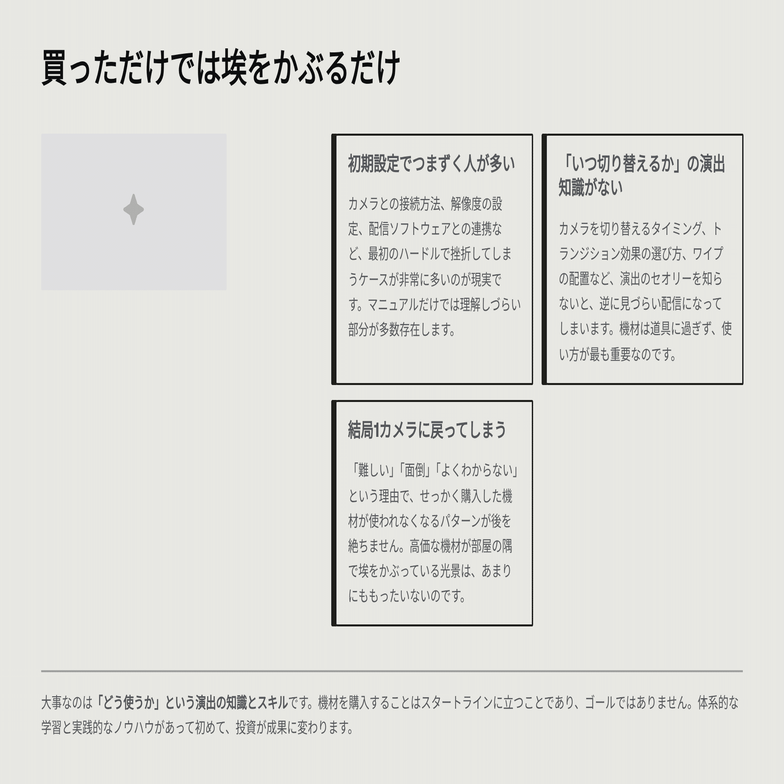 でも、機材を買っただけじゃ意味がない