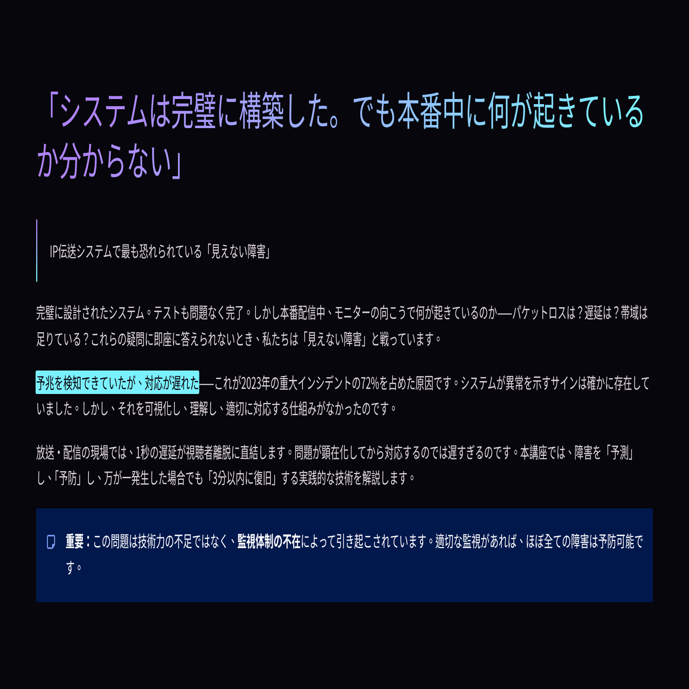 2023年の放送事故分析(※1)によれば、重大インシデントの72%は「予兆を検知できていたが、監視体制が不十分で対応が遅れた」ケースでした。パケットロス率が0.3%から1.2%に上昇していた、RTTが20msから60msに増加していた、CPU使用率が65%から92%に跳ね上がっていた——これらの兆候は全て、適切な監視があれば事前に察知できたものです。