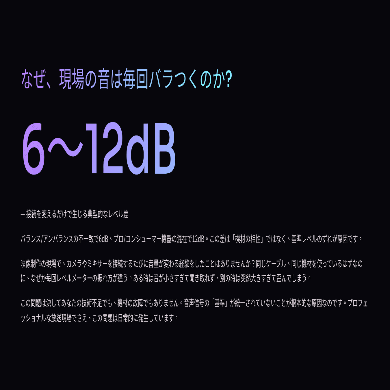 SMPTE(米国映画テレビ技術者協会)が推奨するレベル管理手法であるSMPTE RP 155は、1990年代から存在する。にもかかわらず、映像制作の現場では音声レベルの不一致によるトラブルが後を絶たない。その根本原因は、「音の基準線」を引かないまま本番に臨んでいることにある。