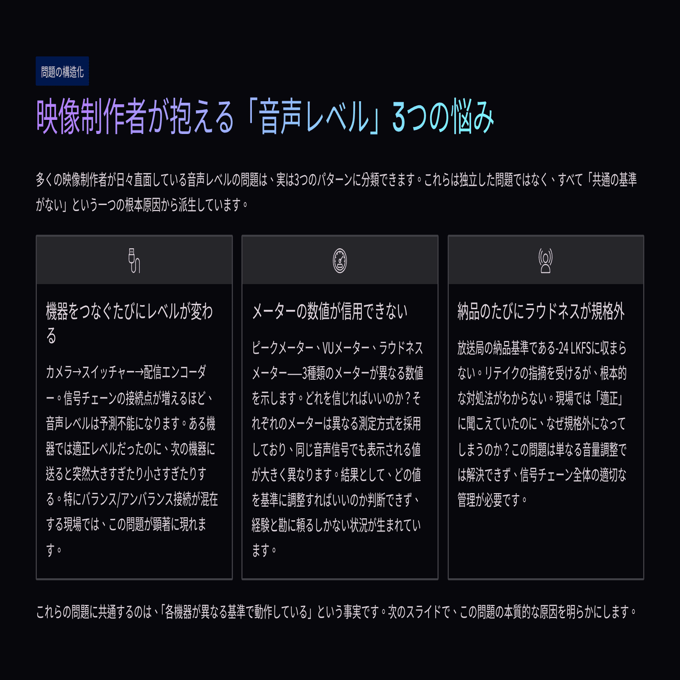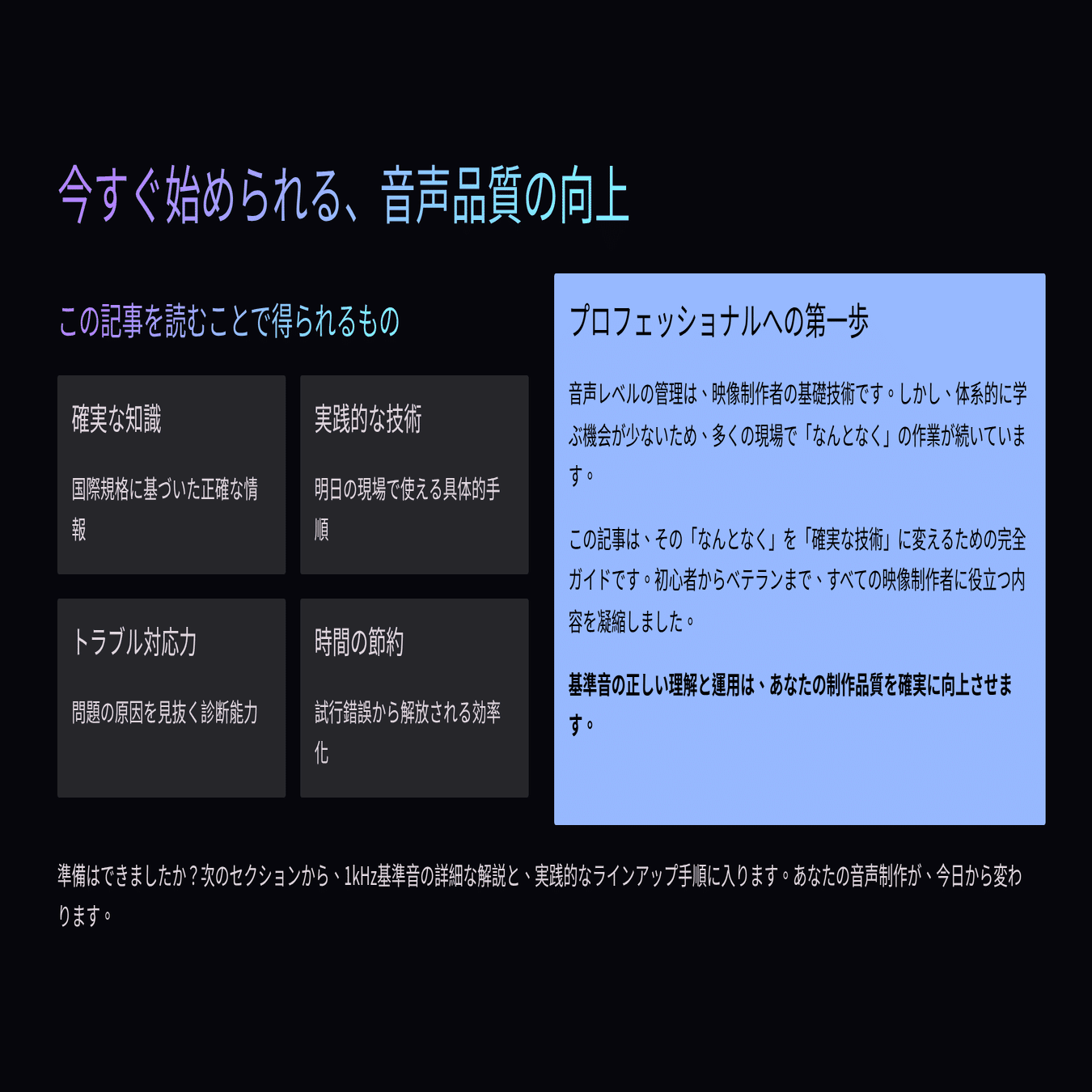 映像でカラーバーを合わせるように、音声で基準音を合わせる。この習慣を身につけるだけで、音声トラブルの構造的な原因を取り除くことができる。