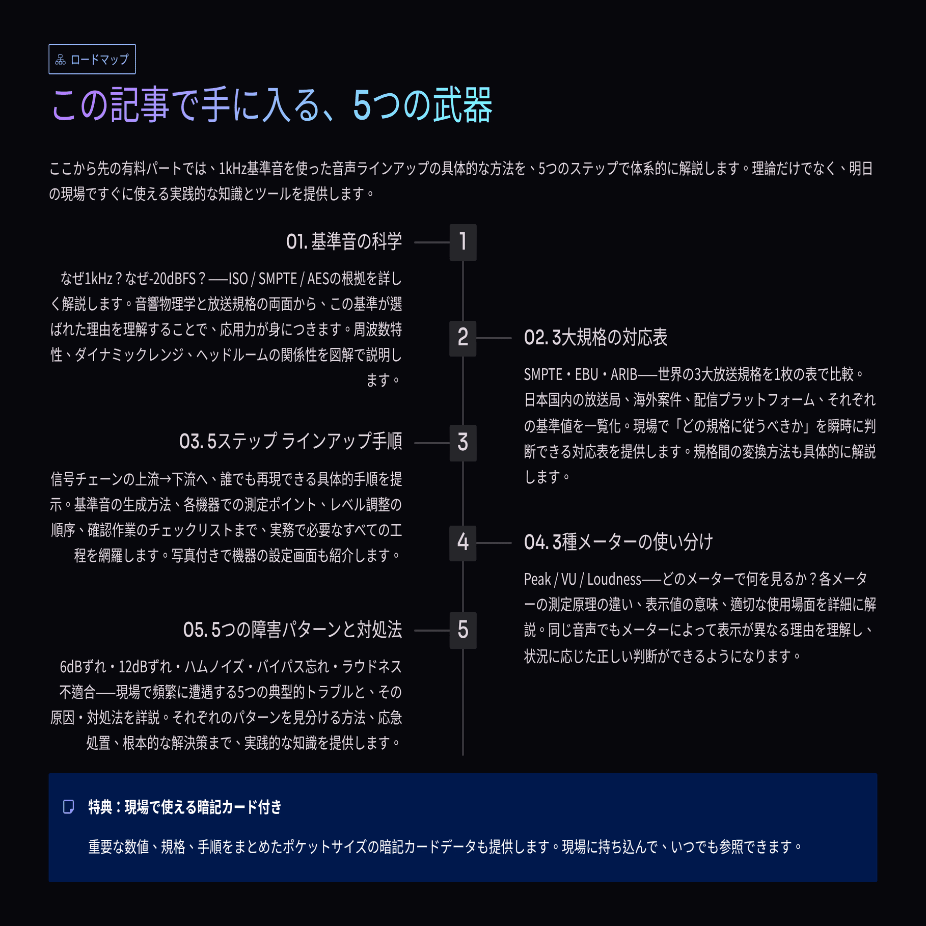 世界には主要な基準レベル規格が3系統存在する。SMPTE RP 155(北米・日本)、EBU R68(欧州)、そして日本の放送で使われるARIB TR-B32のラウドネス基準。これらの関係を1枚の対応表にまとめ、「どの現場でどの数値を使えばよいか」を即座に判断できるようにする。