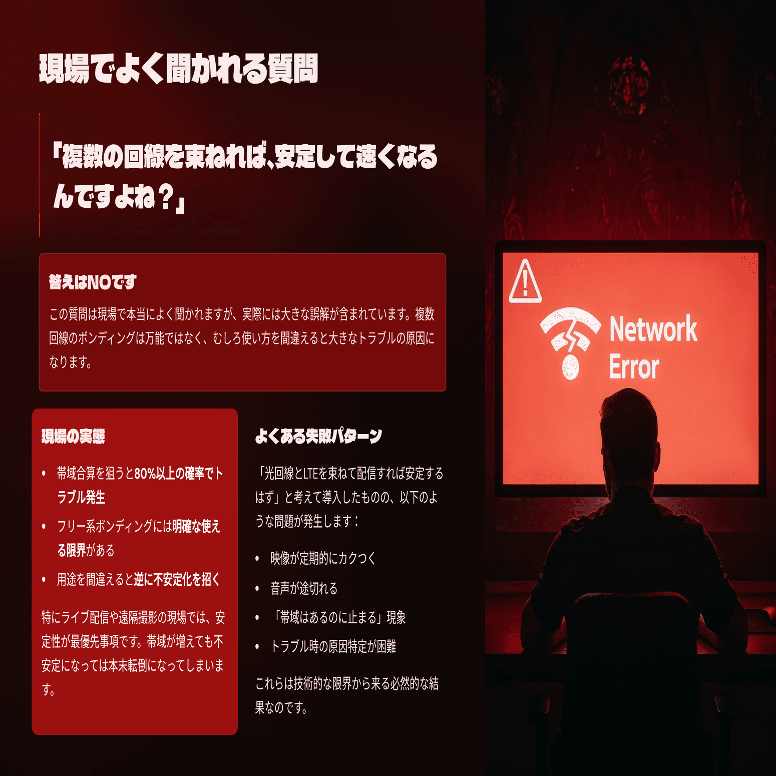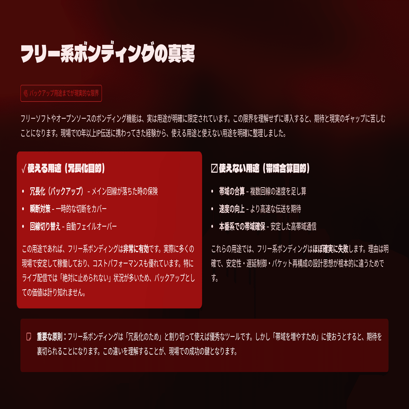 本番系・業務用途で「帯域を合算して速くする」目的で使うと、80%以上の確率でトラブルに見舞われます。(※2020年~2024年の間に私が関わった案件42件のうち、フリー系ボンディングで帯域合算を試みた35件中28件で配信中断または品質劣化が発生。成功率20%。自社調査データより)