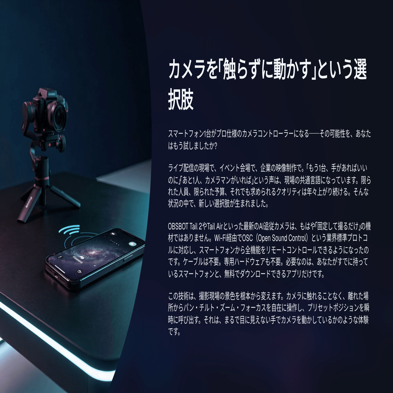 ① セットアップの完全ワイヤレス化 カメラとコントローラーをケーブルでつなぐ必要がない。撮影エリアとオペレーションエリアを物理的に切り離せる。