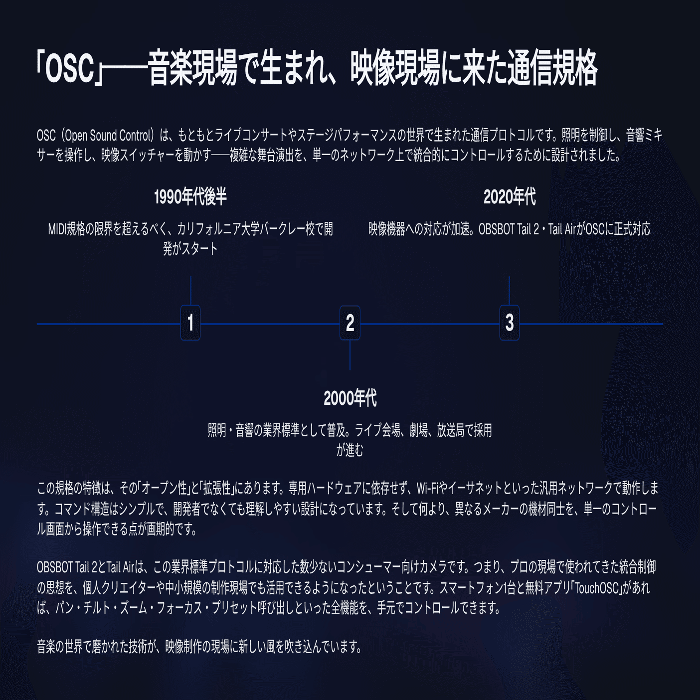 OSC(Open Sound Control)は、もともと音楽の現場で生まれた通信規格だ。ライブコンサートでは照明・音響・映像を1つのコントローラーで束ねるのが当たり前になっている。そのプロトコルが、いまカメラのコントロールにも使われ始めている。