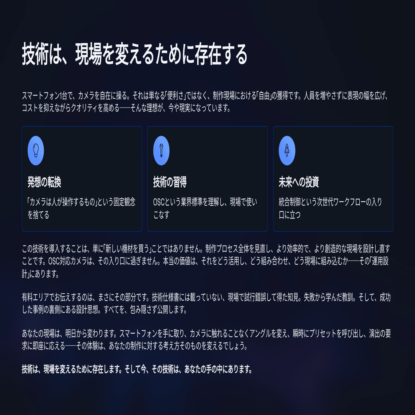 有料エリアでは、実際の接続手順・コマンド体系・TouchOSCのレイアウト設計まで、現場で即日使えるレベルで解説する。「どのIPアドレスに」「どのポート番号で」「どのコマンドを送れば」カメラが動くのか、すべて数値と根拠を示しながら説明する。