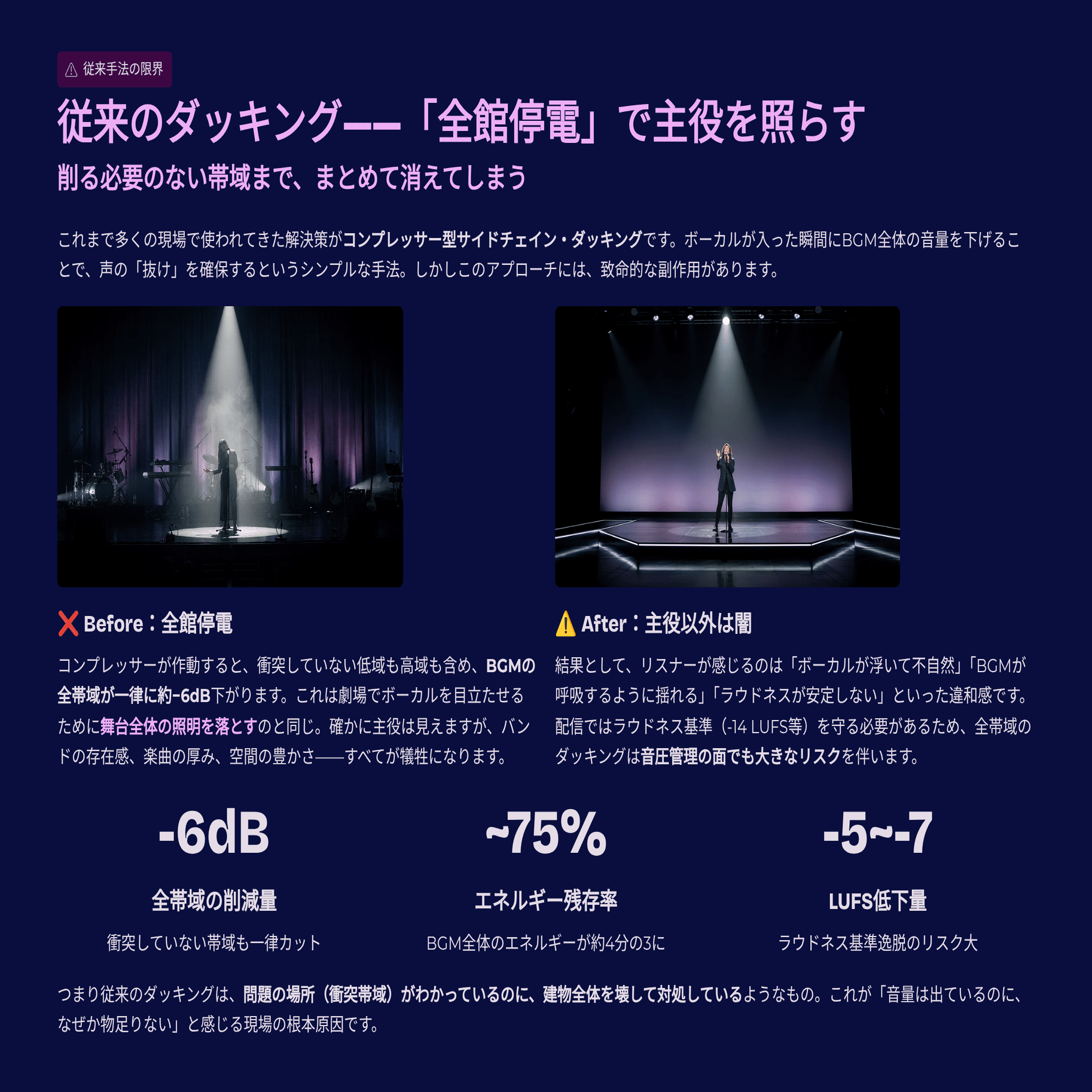 つまり従来のダッキングは、ボーカルが入ったら、BGM全体の音量を一律に下げる