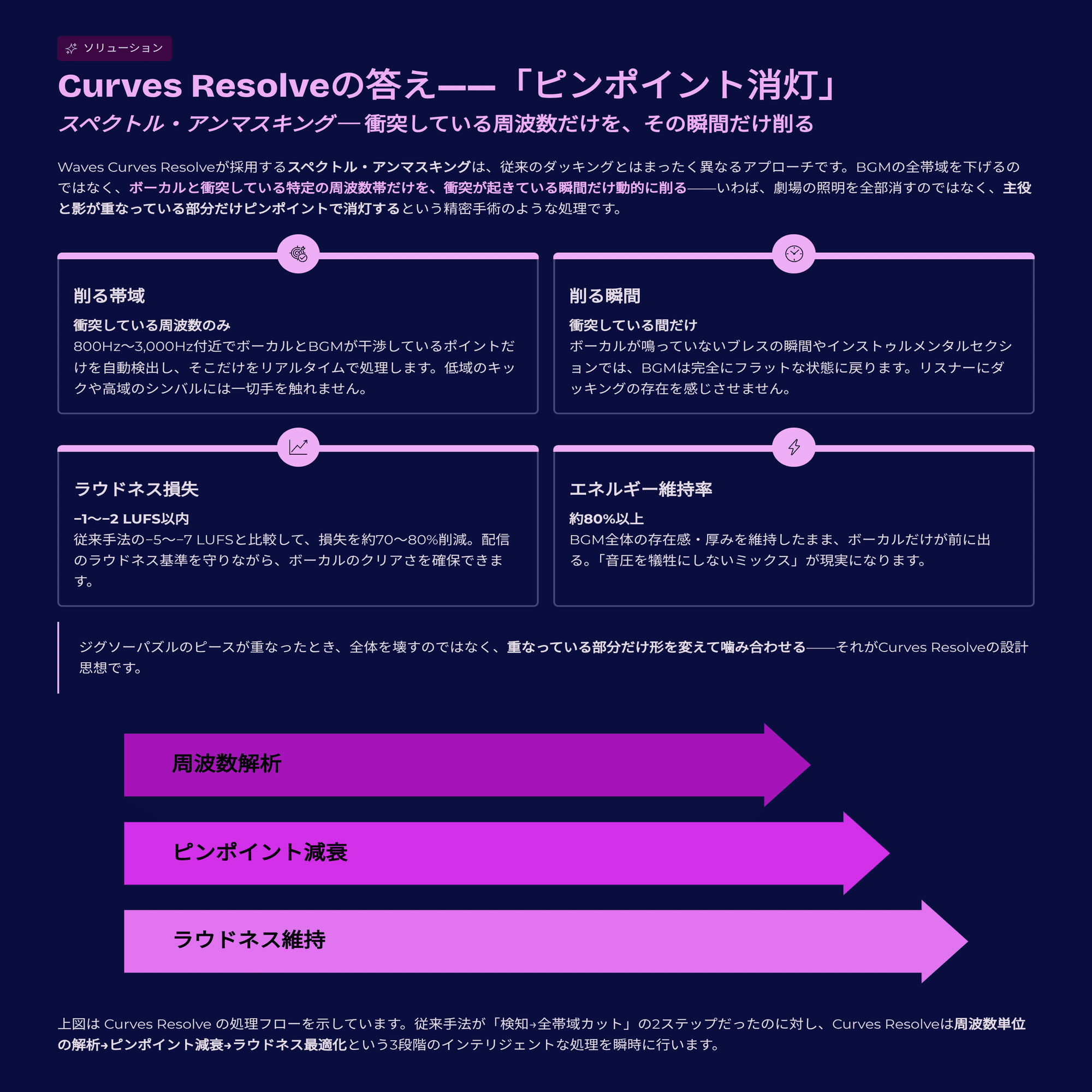 Curves Resolveは、ボーカルとBGMの周波数分布をリアルタイムで比較し、