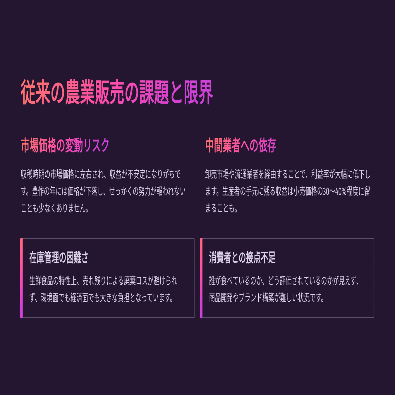 農家の売上構造を根本から変える「システム設計者」として関われる。