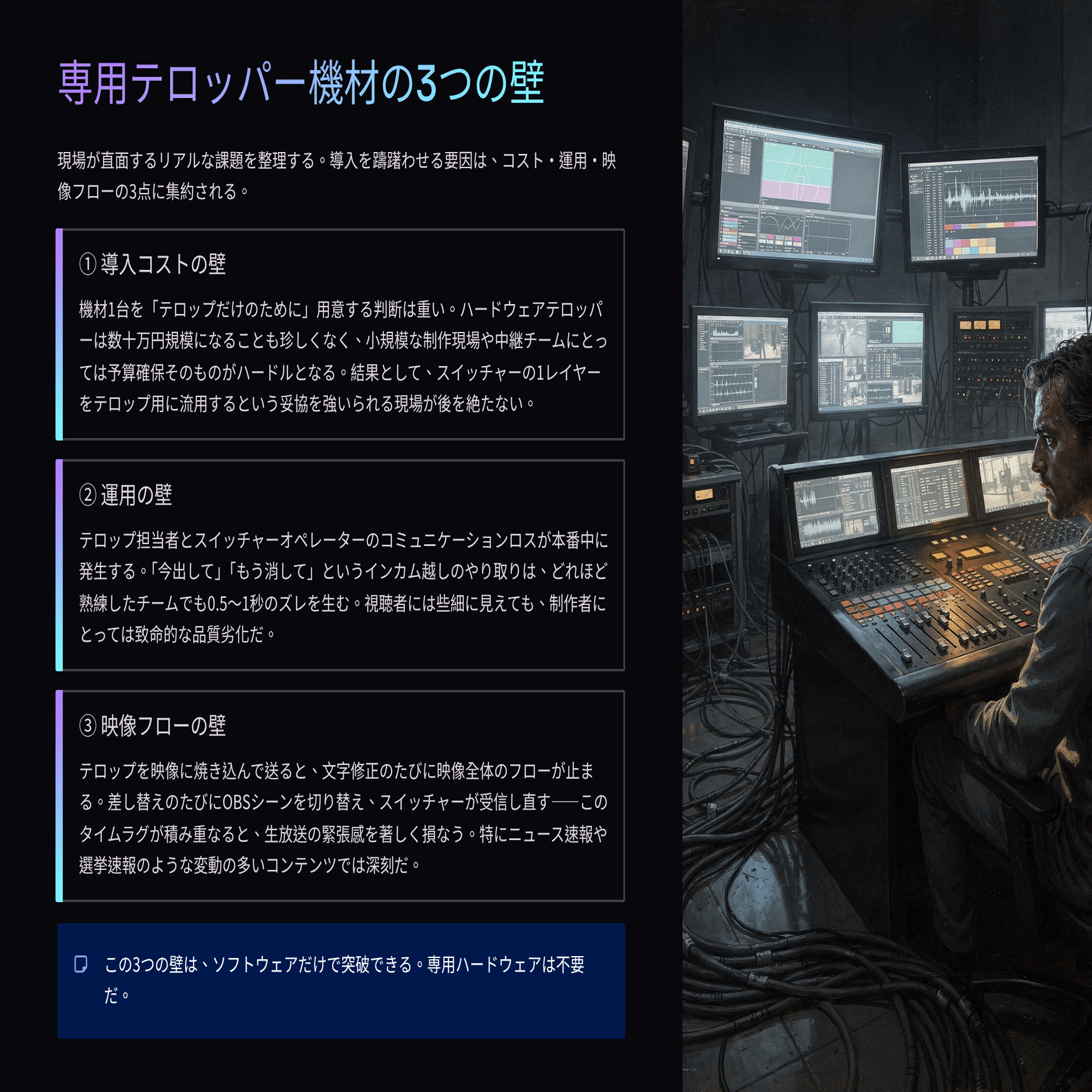 専用のテロッパー機材は、こうした問題を解決するために存在している。