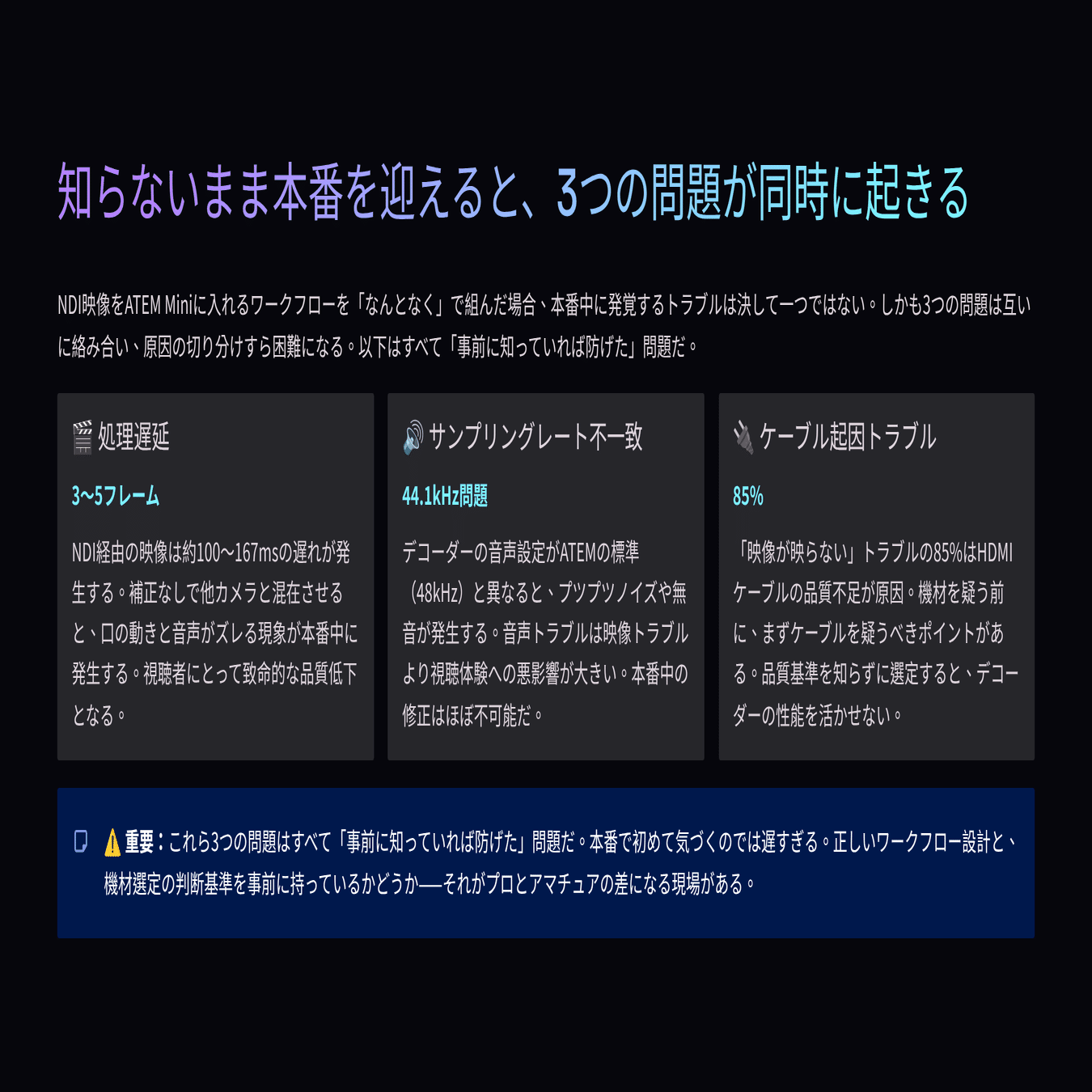 2024年のATEM Mini導入現場200件以上をATEM認定トレーナーとして調査した結果、NDI関連のトラブルとして報告された案件のうち、