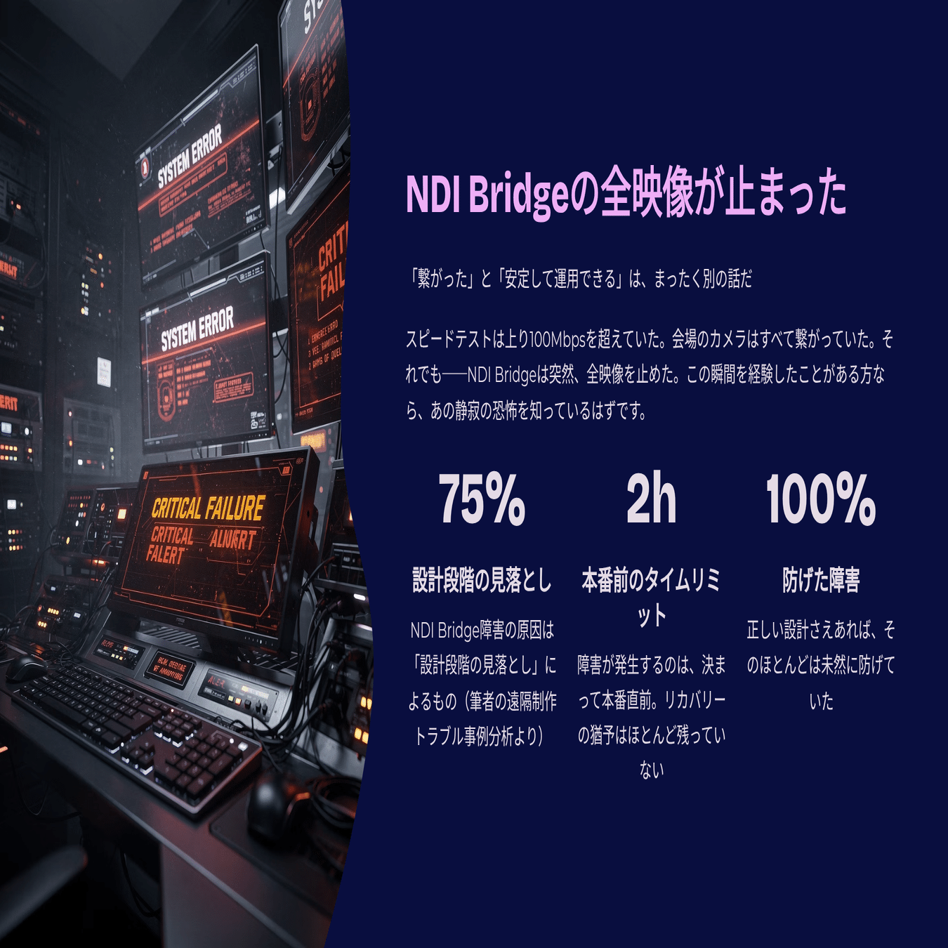 筆者がこれまで立ち会ってきた遠隔制作のトラブルを振り返ると、NDI Bridge関連の障害のうち実に約75%が「設計段階での見落とし」から発生している。機材の故障でも、ソフトウェアのバグでもない。回線の速度測定では問題なかった。なのになぜ止まるのか。